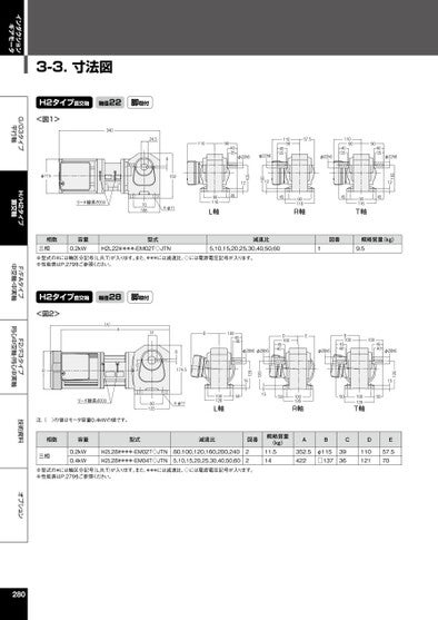インダクションギアモータG/G3タイプ平行軸H/H2タイプ直交軸F/FAタイプ中空軸・中実軸F2/F3タイプ同心中空軸・同心中実軸技術資料オプションφ22h6105129040354590116T軸11090403545110904035φ22h6φ22h657.5110904035φ22h690116R軸12105105124545リード線長さ200701064-φ1190116L軸3-3.⼨法図H2タイプ直交軸軸径22脚取付<図1>φ11534024.530.56150相数三相容量0.2kW型式減速比図番概略質量(kg)H2L22#***-EM02T◇JTN5,10,15,20,25,30,40,50,6019.5※型式の#には軸区分記号(L,R,T)が入ります。また、***には減速比、◇には電源電圧記号が入ります。※性能表はP.279をご参照ください。12015100126R軸5050100126T軸50155012012015D1004540ED1004540D1004540φ28h61004540φ28h6φ28h6φ28h6H2タイプ直交軸軸径28脚取付<図2>B(A)A31C8174.5リード線長さ200801254-φ11100126L軸注.)の値はモータ容量0.4kWの値です。相数容量型式減速比図番概略質量(kg)ABC三相0.2kW0.4kWH2L28#***-EM02T◇JTNH2L28#***-EM04T◇JTN80,100,120,160,200,2405,10,15,20,25,30,40,50,602211.514352.5422φ115□1373936D110121E57.570※型式の#には軸区分記号(L,R,T)が入ります。また、***には減速比、◇には電源電圧記号が入ります。※性能表はP.279をご参照ください。280