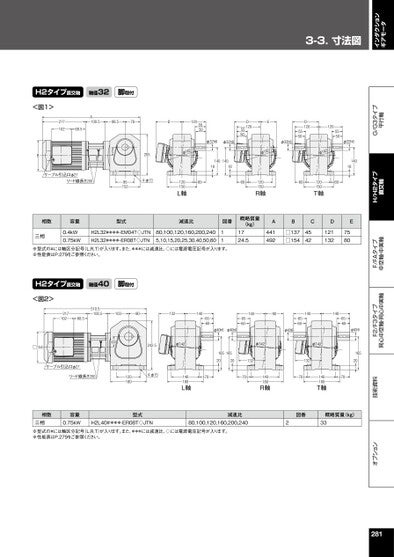 3-3.寸法図インダクションギアモータオプション技術資料F2/F3タイプ同心中空軸・同心中実軸F/FAタイプ中空軸・中実軸H/H2タイプ直交軸G/G3タイプ平行軸H2タイプ直交軸軸径32脚取付A100.521710268.598.576D1205550<図1>Bケーブル引込口φ27リード線長さ200C951522054-φ132φ41120150L軸D1205550E2φ41D12055501205550φ32h62φ41φ32h614018φ32h6φ32h614014018186060120150R軸6060120150T軸相数容量型式減速比図番概略質量(kg)三相0.4kW0.75kWH2L32#***-EM04T◇JTNH2L32#***-ER08T◇JTN80,100,120,160,200,2405,10,15,20,25,30,40,50,60111724.5※型式の#には軸区分記号(L,R,T)が入ります。また、***には減速比、◇には電源電圧記号が入ります。※性能表はP.279をご参照ください。A441492BC□137□1544542D121132E7580H2タイプ直交軸軸径40脚取付21710268.5510.5100.5<図2>□154ケーブル引込口φ27リード線長さ200103901321401409014014065606560φ40h6φ40h66560φ40h653.5242.5φ142φ142φ14216516520201324-φ151201807070140180L軸140180R軸1327070140180T軸6560φ40h616520相数三相容量0.75kW型式減速比図番概略質量(kg)H2L40#***-ER08T◇JTN80,100,120,160,200,240233※型式の#には軸区分記号(L,R,T)が入ります。また、***には減速比、◇には電源電圧記号が入ります。※性能表はP.279をご参照ください。281