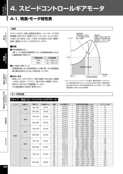 インダクションギアモータG/G3タイプ平行軸H/H2タイプ直交軸F/FAタイプ中空軸・中実軸F2/F3タイプ同心中空軸・同心中実軸技術資料オプション4.スピードコントロールギアモータ4-1.特長・モータ特性表特長ギアモータのモータ部に速度検出用のレートジェネレータ(交流発電機)を取り付け、専用のスピードコントローラにより50~1400r/min50Hz)、50~1700r/min60Hz)の広い範囲で自由に速度をコントロールできるギアモータです。使用限界線(連続運転した場合にモータの温度上昇が問題となる範囲)トルク(%)無負荷時N回転に設定した場合の負荷変動に伴う回転速度の変動を表現しています。(速度変動率はおよそ3%です。)■特長❶可変速範囲が広い(株)ニッセイ独自の回路設計により、低速回転域50r/minから連続使用が可能です。電源周波数50Hz60Hz可変速範囲50~1400r/min50~1700r/min100%❷出力特性に優れている低速回転域における許容負荷トルク値が高く、また高速回転域の幅も右図のように広い特性を持っています。❸機種が豊富用途により、コネクタ付リード線で接続できるU型に2種類(100V、200V)、プラグイン型のP型に6種類(100V、200V)と大きくわけて8種類揃っています。※仕様詳細はP.628をご参照ください。モータ特性表Hタイプ単相(スピードコントロールギアモータ)(連続運転可能範囲)50r/min高速回転速度範囲回転速度(r/min)※スピードコントロール・ギアモータの場合、電源周波数にかかわらず、同一回転速度が得られます。たとえば50Hz地区で設定した回転速度が60Hz地区でも変化せず同じ回転速度を得ることができます。ただし、最高回転速度が1400r/min以内の範囲)シリーズ容量(W)電圧(V)周波数(Hz)15W25W40W60W90W100/100200/20050/6050/60100/10050/60200/20050/60100/10050/60200/20050/60100/10050/60200/20050/60100/10050/60200/20050/60MINI284枠番152215221522281522281828321828321828321828321828324018283240MAX電流(A)0.6/0.60.6/0.60.3/0.30.3/0.30.6/0.60.6/0.60.7/0.70.4/0.40.4/0.40.4/0.40.9/0.90.9/0.90.9/0.90.5/0.50.5/0.50.5/0.51.0/1.71.0/1.71.0/1.70.8/0.90.8/0.90.8/0.91.4/2.01.4/2.01.4/2.01.4/2.00.9/1.00.9/1.00.9/1.01.0/1.1高速回転速度範囲(r/min)500~1350/550~1650500~1350/550~1650600~1400/750~1700600~1400/750~1700750~1350/1000~1650750~1350/1000~1650550~1400/650~1650850~1350/1000~1650850~1350/1000~1650600~1350/800~1650800~1350/1050~1650800~1350/1050~1650800~1350/1050~1650900~1350/1300~1650900~1350/1300~1650900~1350/1300~1650700~1350/800~1650700~1350/800~1650700~1350/800~1650700~1350/800~1650700~1350/800~1650700~1350/800~1650950~1300/1150~1600950~1300/1150~1600950~1300/1150~1600950~1350/1100~16501000~1350/1150~16001000~1350/1150~16001000~1350/1150~1600900~1350/1100~1650コンデンサ(μF)661.51.5888222121212333202020555262626266.56.56.56.5