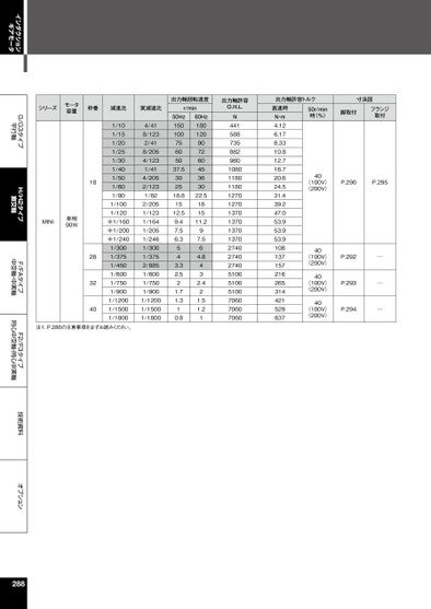 インダクションギアモータG/G3タイプ平行軸H/H2タイプ直交軸F/FAタイプ中空軸・中実軸F2/F3タイプ同心中空軸・同心中実軸技術資料オプションシリーズモータ容量MINI単相90W枠番減速比実減速比r/min出力軸回転速度出力軸許容O.H.L.1/101/151/201/251/301/401/501/601/801/1001/120※1/160※1/200※1/2401/3001/3751/4501/6001/7501/9001/12001/15001/18004/418/1232/418/2054/1231/414/2052/1231/822/2051/1231/1641/2051/2461/3001/3752/8851/6001/7501/9001/12001/15001/18001828324050Hz15010075605037.5302518.81512.59.47.56.3543.32.521.71.310.860Hz18012090726045363022.5181511.297.564.8432.421.51.21N441588735882980108011801180127012701370137013701370274027402740510051005100706070607060出力軸許容トルク寸法図高速時N・m4.126.178.3310.812.716.720.624.531.439.247.053.953.953.910813715721626531442152963750r/min時(%)脚取付フランジ取付40(100V)(200V)P.290P.29540(100V)(200V)40(100V)(200V)40(100V)(200V)P.292P.293P.294───注1.P.286の注意事項を必ずお読みください。288