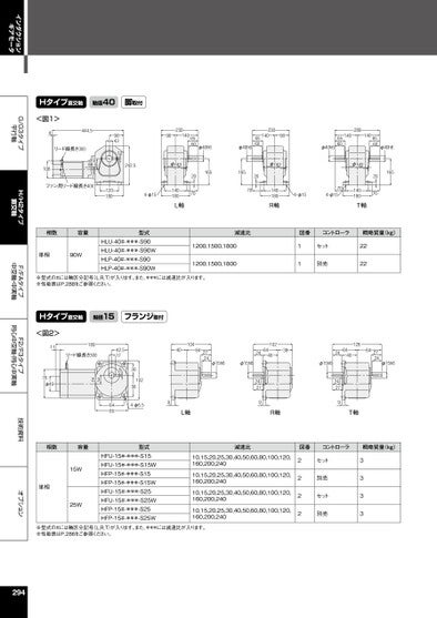 インダクションギアモータG/G3タイプ平行軸H/H2タイプ直交軸F/FAタイプ中空軸・中実軸F2/F3タイプ同心中空軸・同心中実軸技術資料オプションHタイプ直交軸軸径40脚取付<図1>4444.5リード線長さ300904312230140906560φ40h66560φ40h62301409028014065601406560φ40h6φ40h610868.5242.5φ142ファン用リード線長さ4001201804-φ151652070140180L軸1652070φ142140180R軸4-φ15704-φ15φ142140180T軸1652070相数容量単相90W型式HLU-40#-***-S90HLU-40#-***-S90WHLP-40#-***-S90HLP-40#-***-S90W減速比図番コントローラ概略質量(kg)1200,1500,18001200,1500,180011セット別売2222※型式の#には軸区分記号(L,R,T)が入ります。また、***には減速比が入ります。※性能表はP.288をご参照ください。Hタイプ直交軸軸径15フランジ取付<図2>11189リード線長さ30076φ4022.342.517530102564-φ6.5648510464402724φ15h6φ15h69L軸2424279102644038128246440642724φ15h6φ15h624279R軸T軸相数容量単相15W25W型式HFU-15#-***-S15HFU-15#-***-S15WHFP-15#-***-S15HFP-15#-***-S15WHFU-15#-***-S25HFU-15#-***-S25WHFP-15#-***-S25HFP-15#-***-S25W減速比図番コントローラ概略質量(kg)10,15,20,25,30,40,50,60,80,100,120,160,200,24010,15,20,25,30,40,50,60,80,100,120,160,200,24010,15,20,25,30,40,50,60,80,100,120,160,200,24010,15,20,25,30,40,50,60,80,100,120,160,200,2402222セット別売セット別売3333※型式の#には軸区分記号(L,R,T)が入ります。また、***には減速比が入ります。※性能表はP.286をご参照ください。294