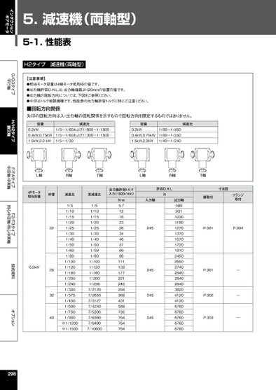 インダクションギアモータG/G3タイプ平行軸H/H2タイプ直交軸F/FAタイプ中空軸・中実軸F2/F3タイプ同心中空軸・同心中実軸技術資料オプション5.減速機(両軸型)5-1.性能表H2タイプ減速機(両軸型)【注意事項】●相当モータ容量は4極モータ使用時の値です。●出力軸許容O.H.L.は、出力軸端面より20mmの位置の値です。●出力軸の回転方向については、下図をご参照ください。●※印はトルク制限機種です。性能表の出力軸許容トルクに特にご注意ください。■回転方向関係矢印の回転方向は入・出力軸の回転関係を示すもので回転方向を限定するものではありません。容量減速比0.2kW0.4kW,0.75kW1.5kW,2.2kW1/5~1/60および1/600~1/15001/5~1/60および1/300~1/15001/5~1/30容量減速比0.2kW0.4kW,0.75kW1.5kW,2.2kW1/80~1/4501/80~1/2401/40~1/240L軸R軸T軸L軸R軸T軸4Pモータ相当容量枠番減速比実減速比0.2kW1/51/101/151/201/251/301/401/501/601/801/1001/1201/1601/2001/2401/3001/3751/4501/6001/7501/900※1/1200※1/1500222832401/51/101/151/201/251/301/401/501/591/801/1001/1201/1601/2001/2367/21207/26507/31277/42407/53007/63607/84807/10600出力軸許容トルク入力(1500r/min)許容O.H.L.NN・m5.7121823283446576988111133177221245294368431588735764764764入力軸出力軸588931103011801270137015701720181024502650274028402840284038204120412067606760676067606760245245245245寸法図脚取付フランジ取付P.301P.304P.301P.302P.303―――298