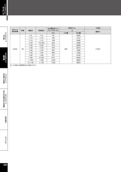 インダクションギアモータG/G3タイプ平行軸H/H2タイプ直交軸F/FAタイプ中空軸・中実軸F2/F3タイプ同心中空軸・同心中実軸技術資料オプション4Pモータ相当容量枠番減速比実減速比2.2kW501/51/101/151/201/251/301/401/501/601/801/100※1/1201/51/101/1512/2352/491/301/401/501/603/2351/981/120注1.P.298の注意事項を必ずお読みください。出力軸許容トルク入力(1500r/min)N・m6312618925231537848760973197412201230許容O.H.L.N入力軸392出力軸392044104900549060806570706075508130843088208820寸法図脚取付P.304300