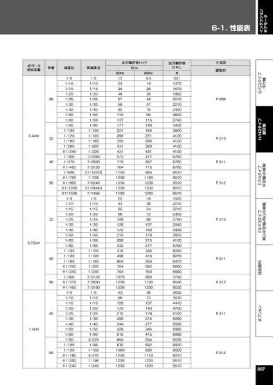 6-1.性能表インダクションギアモータオプション技術資料F2/F3タイプ同心中空軸・同心中実軸F/FAタイプ中空軸・中実軸H/H2タイプ直交軸G/G3タイプ平行軸4Pモータ相当容量枠番減速比実減速比1/51/101/151/201/251/301/401/501/601/801/1001/1201/1601/200※1/2401/3001/375※1/4501/600※1/750※1/900※1/1200※1/15001/51/101/151/201/251/301/401/501/601/801/1001/1201/160※1/200※1/2401/300※1/375※1/4501/51/101/151/201/251/301/401/501/601/801/1001/120※1/160※1/200※1/2401/51/101/151/201/251/301/401/501/591/801/1001/1201/1601/2001/2367/20807/26007/312021/122201/7287/624021/244401/14561/51/101/151/201/251/301/401/501/591/801/1001/1201/1601/2001/2407/21207/26507/31801/51/101/151/201/251/301/401/501/603/2351/981/1203/4701/1961/2402832405032405040500.4kW0.75kW1.5kW出力軸許容トルクN・m出力軸許容O.H.L.50Hz1223344657699211513717722126635543143157271576411501230123012301230224365861081281722152583324164986647647641070123012304386128172215258344429515664830100012301230123060Hz9.51928384857769511514818422129536943147759771595511901230123012301836547289107143179215277346415554692764895112012303672107143179215277346415554692830111012301230N9311470167018602010221024502650274034303820412041204120412067606760676095109510951095109510152020102210245027402940343038204120578060806270647066606660774080408530265035304410470051005290559058806080853088209020931095109510寸法図脚取付P.309P.310P.311P.312P.310P.311P.312P.311P.312307
