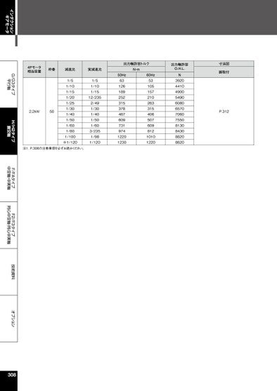インダクションギアモータG/G3タイプ平行軸H/H2タイプ直交軸F/FAタイプ中空軸・中実軸F2/F3タイプ同心中空軸・同心中実軸技術資料オプション4Pモータ相当容量枠番減速比実減速比2.2kW501/51/101/151/201/251/301/401/501/601/801/100※1/1201/51/101/1512/2352/491/301/401/501/603/2351/981/120注1.P.306の注意事項を必ずお読みください。出力軸許容トルクN・m出力軸許容O.H.L.50Hz631261892523153784876097319741220123060Hz5310515721026331540650760981210101220N392044104900549060806570706075508130843088208820寸法図脚取付P.312308