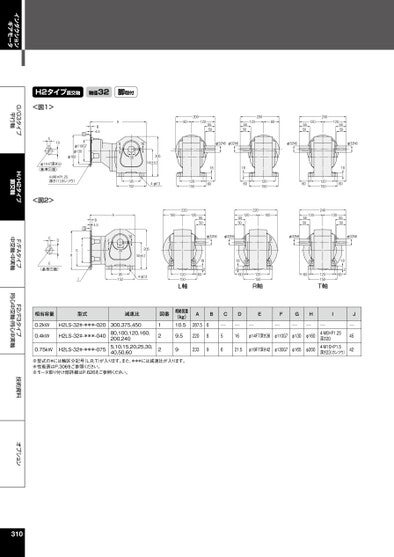 インダクションギアモータG/G3タイプ平行軸H/H2タイプ直交軸F/FAタイプ中空軸・中実軸F2/F3タイプ同心中空軸・同心中実軸技術資料オプションφ32h6φ32h6555018605550186012015060186012015024022012010012055501205550φ32h6φ32h6φ32h6φ32h62001208024012055501205550φ32h6φ32h6555018260D─16120150R軸60120150T軸18260E─F─G─H─φ14F7深さ36φ110G7φ130φ16021.5φ19F7深さ42φ130G7φ165φ200I─4-M8×P1.25深さ204-M10×P1.5深さ23(カンツウ)J─4542H2タイプ直交軸軸径32脚取付<図1>510B4.5Sφ110G7φ130φ160A8φ11H7深さ33(基準□面)S4-M8×P1.25深さ11(カンツウ)<図2>10205140±0.24-φ133595152CDE(基準□面)SSFGHIAB4.510J3595152205140±0.24-φ1320080120120150220100120555018260120150L軸相当容量型式減速比図番0.2kW0.4kWH2LS-32#-***-020H2LS-32#-***-0400.75kWH2LS-32#-***-075300,375,45080,100,120,160,200,2405,10,15,20,25,30,40,50,60122概略質量(kg)10.59.59AB287.5220233889C─56※型式の#には軸区分記号(L,R,T)が入ります。また、***には減速比が入ります。※性能表はP.306をご参照ください。※モータ取り付け部詳細はP.626をご参照ください。310