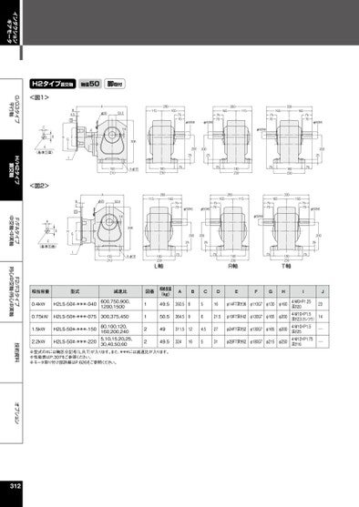 インダクションギアモータG/G3タイプ平行軸H/H2タイプ直交軸F/FAタイプ中空軸・中実軸F2/F3タイプ同心中空軸・同心中実軸技術資料オプションH2タイプ直交軸軸径50脚取付<図1>Aφ20B4.5SCJDHFGE(基準□面)SI53.5143082801151652801651153301651657570φ50h6φ50h675707570φ50h620020025257570φ50h6200251502104-φ18180230757518023075751802302801151652801651153301651657570φ50h6φ50h6757020020025257575φ50h67570757570φ50h62002575180230T軸180230R軸1502104-φ18180230L軸53.514308Aφ20BCS<図2>8DHFGE(基準□面)SI相当容量型式減速比0.4kWH2LS-50#-***-040600,750,900,1200,15000.75kWH2LS-50#-***-075300,375,4501.5kWH2LS-50#-***-1502.2kWH2LS-50#-***-22080,100,120,160,200,2405,10,15,20,25,30,40,50,60図番概略質量(kg)ABCDEFGHI112249.5350.550.5364.58949311.51249.532416564.5516φ14F7深さ36φ110G7φ130φ16021.5φ19F7深さ42φ130G7φ165φ2002731φ24F7深さ52φ130G7φ165φ200φ28F7深さ62φ180G7φ215φ2504-M8×P1.25深さ204-M10×P1.5深さ23(カンツウ)4-M10×P1.5深さ254-M12×P1.75深さ16J2314──※型式の#には軸区分記号(L,R,T)が入ります。また、***には減速比が入ります。※性能表はP.307をご参照ください。※モータ取り付け部詳細はP.626をご参照ください。312
