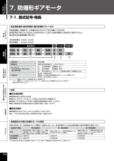 インダクションギアモータG/G3タイプ平行軸H/H2タイプ直交軸F/FAタイプ中空軸・中実軸F2/F3タイプ同心中空軸・同心中実軸技術資料オプション7.防爆形ギアモータ7-1.型式記号・特長安全増防爆形・耐圧防爆形・耐圧防爆形ブレーキ付S型減速機に、防爆形モータを組み合わせたタイプをご用意しております。型式記号は下記によって区分しておりますので、ご注文・ご照会の際はこの記号でご指示ください。基本型式はS型減速機に準じます。安全増防爆形:0.2kW~2.2kW耐圧防爆形:0.4kW~2.2kWH2LH2LSS3240基本型式LT①80240040075補助記号XX②モータタイプ仕様記号N1N2③T9④①基本型式②補助記号③モータタイプ200V/50.60Hz220V/60Hz4極屋内仕様④仕様記号S型減速機特殊仕様追加認識記号必ずXが付きます。N1:安全増防爆形防爆構造eG3N2:耐圧防爆形防爆構造d2G4N3:耐圧防爆形ブレーキ付(ブレーキ手動開放装置付)防爆構造d2G4端子箱位置指示記号詳細はP.317の端子箱位置指示記号についてをご参照ください。発注時に、記号を指定してください。注1.インバータ駆動はできません。商用電源(直入れ)駆動用です。インバータ駆動においては法令によりモータとインバータを組み合わせた防爆検定品であることが必要です。詳細はお問い合わせください。特長■安全増防爆形●耐環境性強化・長寿命化を実現●運転中に火花やアークが生じないよう設計し安全性を高めた電動機です。●防爆形に伴う安全性および冷却は工場電気設備防爆指針を満足しております。●厚生労働省指定の防爆型式検定代行機関の検定に合格しております。■耐圧防爆形●防爆構造はd2G4ですので、ほとんどの対象ガスに対応できます。●ブレーキ付が対応可能で幅広い危険場所と用途にご使用できます。危険箇所の分類と防爆形モータの選定危険の程度により、危険箇所は3つの種別に分類されます。また、各危険箇所により安全増防爆形と耐圧防爆形を選定します。危険箇所の種類特別危険箇所第一類危険箇所第二類危険箇所定義安全増防爆形耐圧防爆形爆発性雰囲気が通常の状態において、連続し長時間にわたり、または頻繁に可燃性ガス蒸気が爆発の危険のある濃度に達する場所×使用不可×使用不可通常の状態において、爆発性雰囲気をしばしば生成するおそれがある場所×使用不可〇使用可能通常の状態において、爆発性雰囲気を生成するおそれが少なく、また、生成した場合でも短時間しか持続しない場所〇使用可能〇使用可能※ガス蒸気を取り扱う場合の危険箇所の判定については、消防庁、労働基準局、都道府県庁などにご相談ください。314