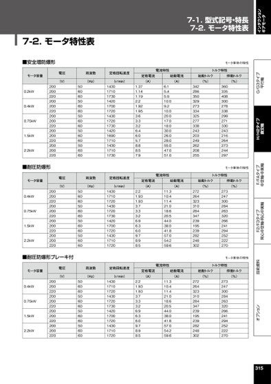 インダクションギアモータ7-1.型式記号・特長7-2.モータ特性表オプション技術資料F2/F3タイプ同心中空軸・同心中実軸F/FAタイプ中空軸・中実軸H/H2タイプ直交軸G/G3タイプ平行軸7-2.モータ特性表■安全増防爆形モータ単体の特性モータ容量電圧(V)周波数(Hz)定格回転速度(r/min)電流特性トルク特性定格電流(A)始動電流(A)始動トルク(%)停動トルク(%)0.2kW0.4kW0.75kW1.5kW2.2kW200200220200200220200200220200200220200200220■耐圧防爆形モータ容量電圧(V)0.4kW0.75kW1.5kW2.2kW200200220200200220200200220200200220■耐圧防爆形ブレーキ付モータ容量電圧(V)0.4kW0.75kW1.5kW2.2kW2002002202002002202002002202002002205060605060605060605060605060605060605060605060605060605060605060605060605060601430171017301420170017201430172017301420169017101430171017301.371.141.192.21.921.953.63.33.26.46.05.78.88.57.96.15.45.910.09.210.020.017.018.030.026.028.055.047.051.0342286350329273334325277338243203249262208255360335408300278338299271330243216264273244297周波数(Hz)定格回転速度(r/min)電流特性トルク特性定格電流(A)始動電流(A)始動トルク(%)停動トルク(%)モータ単体の特性1430171017201430172017301420170017201430171017202.21.931.933.73.33.26.96.36.09.78.98.511.310.411.421.018.620.544.038.041.857.054.259.6272264323310284347239195239282248302273247300284263320266241294252222270周波数(Hz)定格回転速度(r/min)電流特性トルク特性定格電流(A)始動電流(A)始動トルク(%)停動トルク(%)モータ単体の特性1430171017201430172017301420170017201430171017202.21.931.933.73.33.26.96.36.09.78.98.511.310.411.421.018.620.544.038.041.857.054.259.6272264323310284347239195239282248302273247300284263320266241294252222270315