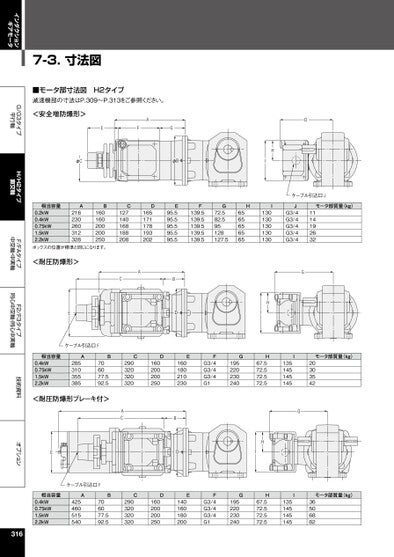 インダクションギアモータG/G3タイプ平行軸H/H2タイプ直交軸F/FAタイプ中空軸・中実軸F2/F3タイプ同心中空軸・同心中実軸技術資料オプション7-3.⼨法図■モータ部寸法図H2タイプ減速機部の寸法はP.309~P.313をご参照ください。<安全増防爆形>EAFφCGφBDHIケーブル引込口J相当容量0.2kW0.4kW0.75kW1.5kW2.2kWA216230260312328B160160200200250C127140168188208D165171178193202E95.595.595.595.595.5F139.5139.5139.5139.5139.5G72.582.595128127.5H6565656565I130130130130130JG3/4G3/4G3/4G3/4G3/4ボックスの位置が標準と同じになります。<耐圧防爆形>ACEケーブル引込口FBDHIモータ部質量(kg)1114192632Gモータ部質量(kg)20303542G相当容量A0.4kW0.75kW1.5kW2.2kW285310355385B706077.592.5CDE290320320320160200200250160180210230FG3/4G3/4G3/4G1G195220230240H67.572.572.572.5I135145145145BDHIAC<耐圧防爆形ブレーキ付>Eケーブル引込口F相当容量A0.4kW0.75kW1.5kW2.2kW425460515540B706077.592.5CDE290320320320160200200250140160180200FG3/4G3/4G3/4G1G195220230240H67.572.572.572.5I135145145145モータ部質量(kg)36506882316