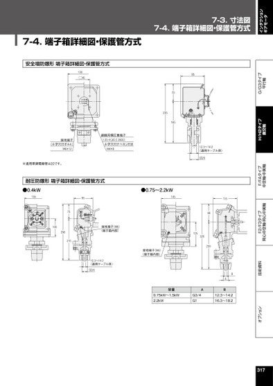 インダクションギアモータ7-3.端子箱詳細図・保護管方式7-4.結線・選定上のご注意オプション技術資料F2/F3タイプ同心中空軸・同心中実軸F/FAタイプ中空軸・中実軸H/H2タイプ直交軸G/G3タイプ平行軸-3.7-4.端子箱詳細図・保護7-4.端子箱詳細図・保護管方式安全増防爆形端子箱詳細図・保護管方式130□459570165235接地端子(十字穴付ボルト)M6×12銅線用裸圧着端子1.25-4(JISC2805)十字穴付ナベネジ付きM4×8※適用厚鋼電線管は22です。耐圧防爆形端子箱詳細図・保護管方式●0.4kW1359512.3~14.2(適用ケーブル径)G3/4●0.75〜2.2kW14511575215105290接地端子(M6)(端子箱内部)12.3~14.2(適用ケーブル径)G3/4接地端子(M6)(端子箱内部)90230125320容量0.75kW~1.5kW2.2kWAG3/4G1BAB12.3~14.216.3~18.2317