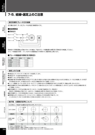 インダクションギアモータG/G3タイプ平行軸H/H2タイプ直交軸F/FAタイプ中空軸・中実軸F2/F3タイプ同心中空軸・同心中実軸技術資料オプション7-5.結線・選定上のご注意耐圧防爆形ブレーキ付の結線出口線は3本で、モータとブレーキは内部で接続済みです。■結線概略図●同時切りRSTUVWMB同時切りで昇降運転は可能ですが、その場合、下記のブレーキ制動遅れ時間(秒)同時切りを考慮してください。※ブレーキ制動遅れ時間・・・スイッチOFFから制動開始までの時間です。制動時間とは異なります。■ブレーキ制動遅れ時間(秒)同時切り容量50Hz60Hz0.4kW0.75kW1.5kW2.2kW0.0490.0680.0950.120選定上のご注意0.0350.0480.0680.085●本製品はニデックテクノモータ(株)のモータを使用しています。●本製品のモータは国内安全検定品となります。●防爆モータは、水平取付限定となります。●減速機が耐え得る振動の限度は0.5G以下です。据え付け面または外部から加わる振動が0.5Gより大きくなる場合は、ケースなどが破損しモータが落下する可能性があります。その場合は必ずモータを支える補助を取り付けて設置してください。●インバータ駆動においては、法令によりモータとインバータを組み合わせた防爆検定品であることが必要です。詳細はお問い合わせください。●耐圧防爆形の0.75kWと耐圧防爆形ブレーキ付(すべて)を組み合わせたタイプはモーメント制限を超えていますので、必ずモータを支える補助を取り付けて設置してください。●耐圧防爆形ブレーキ付の出口線は3本でモータとブレーキは内部で接続済みです。(同時切り)同時切りで昇降運転は可能ですが、上記のブレーキ制動遅れ時間(秒)同時切りを必ず考慮してください。●耐圧防爆形ブレーキ付の反復定格は、0.4kW~1.5kWは40%ED、2.2kWは25%EDです。●標準電圧以外への対応およびターミナルボックスリード線取出し穴の向き変更が可能です。(※)(※)は特注対応です。形状・寸法・納期・価格などの詳細は当社営業所へお問い合わせください。端子箱位置指示記号についてご注文時は、ご希望の位置指示記号をお申し付けください。0.2~2.2kW端子箱仕様記号標準T640枠/50枠0.4kW30°仕様記号T430°T730°T9TXTZ30°T1注1.図はモータ反負荷側より見ています。注2.端子箱の位置変更は、機構上お客様側での変更はできませんのでご注意ください。注3.保護管の位置変更をご希望の場合は、当社営業所へお問い合わせください。特注対応となります。318