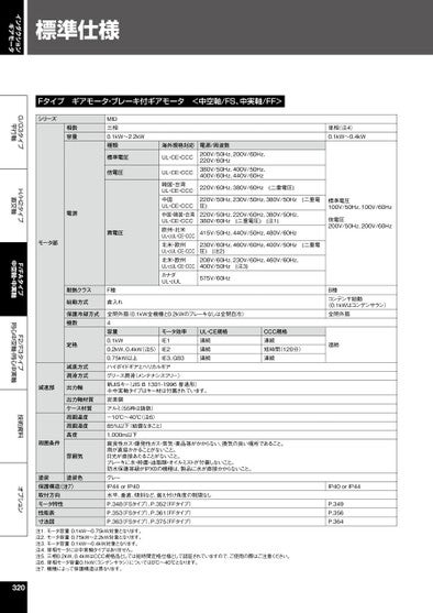 インダクションギアモータG/G3タイプ平行軸H/H2タイプ直交軸F/FAタイプ中空軸・中実軸F2/F3タイプ同心中空軸・同心中実軸技術資料オプション標準仕様Fタイプギアモータ・ブレーキ付ギアモータ<中空軸/FS、中実軸/FF>シリーズ相数容量MID三相0.1kW~2.2kW種類標準電圧倍電圧電源モータ部異電圧耐熱クラスF種始動方式直入れ海外規格対応UL・CE・CCCUL・CE・CCC韓国・台湾UL・CE・CCC中国UL・CE・CCC中国・韓国・台湾UL・CE・CCC欧州・北米UL・cUL・CE・CCC北米・欧州UL・cUL・CE・CCC北米・欧州UL・cUL・CE・CCCカナダUL・cUL電源/周波数200V/50Hz、200V/60Hz、220V/60Hz380V/50Hz、400V/50Hz、400V/60Hz、440V/60Hz220V/60Hz、380V/60Hz(二重電圧)220V/50Hz、230V/50Hz、380V/50Hz(二重電圧)220V/50Hz、220V/60Hz、380V/50Hz、380V/60Hz(二重電圧)(注1)415V/50Hz、440V/50Hz、480V/60Hz230V/60Hz、460V/60Hz、400V/50Hz(二重電圧)(注2)208V/60Hz、230V/60Hz、460V/60Hz、400V/50Hz(注3)575V/60Hz保護冷却方式極数定格減速方式潤滑方式減速部出力軸出力軸材質ケース材質周囲温度周囲湿度高度雰囲気周囲条件塗装色塗装保護構造(注7)取付方向モータ特性性能表寸法図モータ効率IE1IE2IE3、GB3CCC規格連続短時間(120分)連続UL・CE規格連続連続連続全閉外扇(0.1kW全機種と0.2kWのブレーキなしは全閉自冷)4容量0.1kW0.2kW、0.4kW(注5)0.75kW以上ハイポイドギアとヘリカルギアグリース潤滑(メンテナンスフリー)新JISキー(JISB1301-1996普通形)※中実軸タイプはキー材は付属されています。炭素鋼アルミ(55枠は鋳鉄)-10℃~40℃(注6)85%以下(結露なきこと)1,000m以下腐食性ガス・爆発性ガス・蒸気・薬品等がかからない、換気の良い場所であること。雨が直接かかることがないこと。日光が直接あたることがないこと。ブレーキに水・粉塵・油脂類・オイルミストが付着しないこと。防水保護等級がIPX0の機種は、製品に水が直接かからないこと。グレーIP44orIP40水平、垂直、傾斜など、据え付け角度の制限なしP.348(FSタイプ)、P.352(FFタイプ)P.353(FSタイプ)、P.361(FFタイプ)P.363(FSタイプ)、P.375(FFタイプ)単相(注4)0.1kW~0.4kW標準電圧100V/50Hz、100V/60Hz倍電圧200V/50Hz、200V/60HzB種コンデンサ始動(0.1kWはコンデンサラン)全閉外扇連続IP40orIP44P.349P.356P.364注1.モータ容量0.1kW~0.75kW対象となります。注2.モータ容量0.75kW~2.2kW対象となります。注3.モータ容量0.1kW~0.4kW対象となります。注4.単相モータには中実軸タイプはありません。注5.三相0.2kW、0.4kWはCCC規格品としては短時間定格仕様として認証されていますので、ご使用の際はご注意ください。注6.単相モータ容量0.1kW(コンデンサラン)については0℃~40℃となります。注7.機種によって保護構造は異なります。320