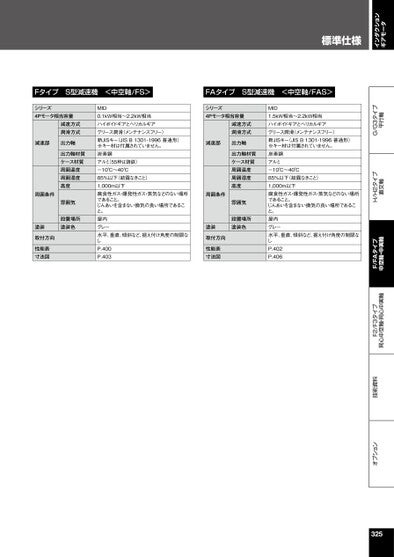 標準仕様インダクションギアモータオプション技術資料F2/F3タイプ同心中空軸・同心中実軸F/FAタイプ中空軸・中実軸H/H2タイプ直交軸G/G3タイプ平行軸FタイプS型減速機<中空軸/FS>FAタイプS型減速機<中空軸/FAS>シリーズ4Pモータ相当容量減速方式潤滑方式減速部出力軸出力軸材質ケース材質周囲温度周囲湿度高度雰囲気設置場所塗装色周囲条件塗装取付方向性能表寸法図MID0.1kW相当~2.2kW相当ハイポイドギアとヘリカルギアグリース潤滑(メンテナンスフリー)新JISキー(JISB1301-1996普通形)※キー材は付属されていません。炭素鋼アルミ(55枠は鋳鉄)-10℃~40℃85%以下(結露なきこと)1,000m以下腐食性ガス・爆発性ガス・蒸気などのない場所であること。じんあいを含まない換気の良い場所であること。屋内グレー水平、垂直、傾斜など、据え付け角度の制限なしP.400P.403シリーズ4Pモータ相当容量減速方式潤滑方式減速部出力軸出力軸材質ケース材質周囲温度周囲湿度高度雰囲気設置場所塗装色周囲条件塗装取付方向性能表寸法図MID1.5kW相当~2.2kW相当ハイポイドギアとヘリカルギアグリース潤滑(メンテナンスフリー)新JISキー(JISB1301-1996普通形)※キー材は付属されていません。炭素鋼アルミ-10℃~40℃85%以下(結露なきこと)1,000m以下腐食性ガス・爆発性ガス・蒸気などのない場所であること。じんあいを含まない換気の良い場所であること。屋内グレー水平、垂直、傾斜など、据え付け角度の制限なしP.402P.406325