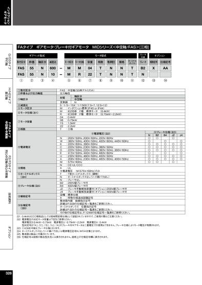 インダクションギアモータG/G3タイプ平行軸H/H2タイプ直交軸F/FAタイプ中空軸・中実軸F2/F3タイプ同心中空軸・同心中実軸技術資料オプションブレーキ仕様ブレーキB2N⑫オプション補助記号仕様記号X⑬AA⑭ターミナルボックスTT⑪取付区分枠番軸区分減速比モータ区分モータ仕様容量相数電源電圧規格NN⑩NN⑨TT⑧0422⑦MR⑥MM⑤60010④NN③FASFAS①5555②ギアヘッド型式モータ型式FAタイプギアモータ・ブレーキ付ギアモータMIDシリーズ<中空軸/FAS>[三相]①取付区分②枠番および出力軸径③軸区分④減速比⑤モータ区分⑥モータ仕様(注1)⑦モータ容量⑧相数⑨電源電圧⑩規格⑪ターミナルボックス(注4)⑫ブレーキ仕様(注5)⑬補助記号⑭仕様記号(注6)FAS:中空軸(55枠アルミのみ)出力軸径材質軸区分中空軸N炭素鋼5:1/5~15X:1/15007.5=7、12.5=12)MMR04081522T:インダクション標準(IP40orIP44):IE2効率F種標準モータ(0.4kW):IE3効率F種標準モータ(0.75kW~2.2kW):0.4kW:0.75kW:1.5kW:2.2kW:三相N〇〇〇〇〇〇〇〇〇⑨電源電圧(注2):200V/50Hz、200V/60Hz、220V/60Hz:380V/50Hz、400V/50Hz、400V/60Hz、440V/60Hz:220V/60Hz、380V/60Hz:220V/50Hz、230V/50Hz、380V/50Hz:220V/50Hz、220V/60Hz、380V/50Hz、380V/60Hz:415V/50Hz、440V/50Hz、480V/60Hz:230V/60Hz、460V/60Hz、400V/50Hz:208V/60Hz、230V/60Hz、460V/60Hz、400V/50Hz:575V/60Hz:CE・UL・CCC:ULNWKCDEUAMNA※電源電圧:M(575V/60Hz)のみ:T型ターミナルボックス(鋼板)T:ターミナルボックスなし(リード線バラ出し)N:ブレーキなしNB2:200V級ブレーキ付:400V級ブレーキ付B4:ブレーキ手動解放装置付(オプション)200V級ブレーキ付J2J4:ブレーキ手動解放装置付(オプション)400V級ブレーキ付空欄:標準仕様X整流器内蔵結線指示記号詳細はP.559の仕様記号一覧表をご参照ください。ターミナルボックス位置指示記号詳細はP.581の仕様記号一覧表をご参照ください。その他の仕様記号は、P.1249の仕様記号一覧表をご参照ください。:特殊仕様追加認識記号⑫ブレーキ仕様(注3)B4〇〇〇〇〇〇〇B2〇〇〇〇〇〇〇J4〇〇〇〇〇〇〇J2〇〇〇〇〇〇〇注1.0.4kWはCCC規格品としては短時間定格仕様として認証されていますので、ご使用の際はご注意ください。注2.電源電圧の対応モータ容量は下記をご参照ください。電源電圧D:0.4kW~0.75kW電源電圧U:0.75kW~2.2kW電源電圧A:0.4kW型式記号が「K」、C」、D」、「U」、A」のブレーキ付ギアモータは二重電圧での使用はできません。ブレーキ仕様によりモータ電圧が制限されます。注3.〇は対応可能なブレーキ仕様となります。注4.ターミナルボックスなし(リード線バラ出し)は電源電圧記号N、Wのみ対象となります。注5.整流器は製品に付属されています。注6.仕様記号は銘板の製品型式名には表示されません。銘板上の仕様記号欄に表示されます。328