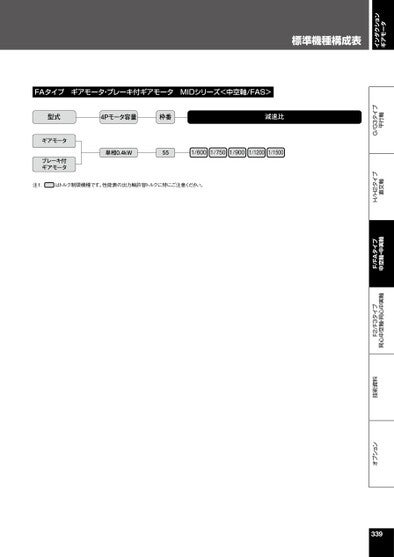 標準機種構成表インダクションギアモータオプション技術資料F2/F3タイプ同心中空軸・同心中実軸F/FAタイプ中空軸・中実軸H/H2タイプ直交軸G/G3タイプ平行軸FAタイプギアモータ・ブレーキ付ギアモータMIDシリーズ<中空軸/FAS>型式4Pモータ容量枠番減速比ギアモータブレーキ付ギアモータ単相0.4kW551/6001/7501/9001/12001/1500注1.はトルク制限機種です。性能表の出力軸許容トルクに特にご注意ください。339