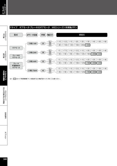 インダクションギアモータG/G3タイプ平行軸H/H2タイプ直交軸F/FAタイプ中空軸・中実軸F2/F3タイプ同心中空軸・同心中実軸技術資料オプション1/101/12.51/151/201/251/301/401/501/601/801/1001/1201/1601/2001/2401/51/7.51/501/601/101/801/12.51/151/201/251/301/401/1001/1201/1601/2001/2401/51/7.51/501/601/51/7.51/501/601/101/801/101/801/12.51/151/201/251/301/401/1001/1201/1601/2001/2401/12.51/151/201/251/301/401/1001/1201/1601/2001/240LRTLRTLRTLRT三相0.1kW三相0.2kW三相0.4kW222832三相0.75kW40ギアモータブレーキ付ギアモータブレーキ手動解放付ギアモータ注1.はトルク制限機種です。性能表の出力軸許容トルクに特にご注意ください。Fタイプギアモータ・ブレーキ付ギアモータMIDシリーズ<中実軸/FF>型式4Pモータ容量枠番軸区分減速比340