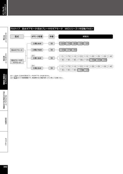 インダクションギアモータG/G3タイプ平行軸H/H2タイプ直交軸F/FAタイプ中空軸・中実軸F2/F3タイプ同心中空軸・同心中実軸技術資料オプションFAタイプ防水ギアモータ・防水ブレーキ付ギアモータMIDシリーズ<中空軸/FAS>型式4Pモータ容量枠番減速比三相0.4kW防水ギアモータ三相0.75kW防水ブレーキ付ギアモータ(注1)三相1.5kW(注1)三相2.2kW555555551/6001/7501/9001/12001/15001/3001/3751/4501/51/7.51/501/601/101/801/12.51/151/201/251/301/401/1001/1201/1601/2001/2401/51/7.51/501/601/101/801/12.51/151/201/251/301/401/1001/120注1.1.5kW、2.2kWの防水ブレーキ付ギアモータはありません。注2.はトルク制限機種です。性能表の出力軸許容トルクに特にご注意ください。342