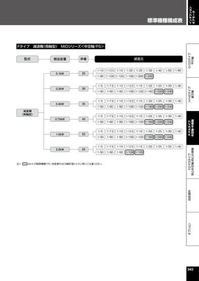 標準機種構成表インダクションギアモータオプション技術資料F2/F3タイプ同心中空軸・同心中実軸F/FAタイプ中空軸・中実軸H/H2タイプ直交軸G/G3タイプ平行軸Fタイプ減速機(両軸型)MIDシリーズ<中空軸/FS>型式相当容量枠番減速比減速機(両軸型)0.1kW0.2kW0.4kW0.75kW1.5kW2.2kW2530354555551/101/12.51/151/201/251/301/401/501/601/801/1001/1201/1601/2001/2401/51/7.51/501/601/101/801/12.51/151/201/251/301/401/1001/1201/1601/2001/2401/51/7.51/501/601/101/801/12.51/151/201/251/301/401/1001/1201/1601/2001/2401/51/7.51/501/601/51/7.51/501/601/51/7.51/501/601/101/801/101/801/101/801/12.51/151/201/251/301/401/1001/1201/1601/2001/2401/12.51/151/201/251/301/401/1001/1201/1601/2001/2401/12.51/151/201/251/301/401/1001/120注1.はトルク制限機種です。性能表の出力軸許容トルクに特にご注意ください。343