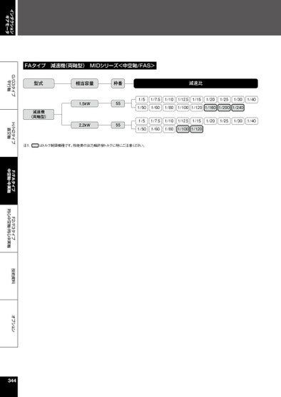 インダクションギアモータG/G3タイプ平行軸H/H2タイプ直交軸F/FAタイプ中空軸・中実軸F2/F3タイプ同心中空軸・同心中実軸技術資料オプションFAタイプ減速機(両軸型)MIDシリーズ<中空軸/FAS>型式相当容量枠番減速比減速機(両軸型)1.5kW2.2kW55551/51/7.51/501/601/51/7.51/501/601/101/801/101/801/12.51/151/201/251/301/401/1001/1201/1601/2001/2401/12.51/151/201/251/301/401/1001/120注1.はトルク制限機種です。性能表の出力軸許容トルクに特にご注意ください。344