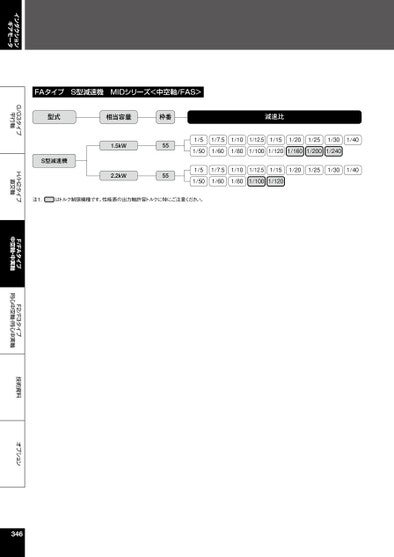 インダクションギアモータG/G3タイプ平行軸H/H2タイプ直交軸F/FAタイプ中空軸・中実軸F2/F3タイプ同心中空軸・同心中実軸技術資料オプションFAタイプS型減速機MIDシリーズ<中空軸/FAS>型式相当容量枠番減速比S型減速機1.5kW2.2kW55551/51/7.51/501/601/51/7.51/501/601/101/801/101/801/12.51/151/201/251/301/401/1001/1201/1601/2001/2401/12.51/151/201/251/301/401/1001/120注1.はトルク制限機種です。性能表の出力軸許容トルクに特にご注意ください。346