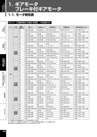 インダクションギアモータG/G3タイプ平行軸H/H2タイプ直交軸F/FAタイプ中空軸・中実軸F2/F3タイプ同心中空軸・同心中実軸技術資料オプション1.ギアモータブレーキ付ギアモータ1-1.モータ特性表Fタイプ三相標準電圧/倍電圧/異電圧<中空軸/FS>シリーズ容量MID0.1kW0.2kW0.4kW0.75kW1.5kW2.2kW電源・規格記号NNWNKNCNDNENANMANNWNKNCNDNENANMANNWNKNCNDNENANMANNWNKNCNDNENUNMANNWNKNCNENUNMANNWNKNCNENUNMA電圧(V)周波数(Hz)定格電流(A)始動電流(A)定格回転速度(r/min)200/200/220380/400/400/440220/380220/230/380220/220/380/380415/440/480208/230/460/400575200/200/220380/400/400/440220/380220/230/380220/220/380/380415/440/480208/230/460/400575200/200/220380/400/400/440220/380220/230/380220/220/380/380415/440/480208/230/460/400575200/200/220380/400/400/440220/380220/230/380220/220/380/380415/440/480230/460/400575200/200/220380/400/400/440220/380220/230/380415/440/480230/460/400575200/200/220380/400/400/440220/380220/230/380415/440/480230/460/40057550/60/6050/50/60/6060/6050/50/5050/60/50/6050/50/6060/60/60/506050/60/6050/50/60/6060/6050/50/5050/60/50/6050/50/6060/60/60/506050/60/6050/50/60/6060/6050/50/5050/60/50/6050/50/6060/60/60/506050/60/6050/50/60/6060/6050/50/5050/60/50/6050/50/6060/60/506050/60/6050/50/60/6060/6050/50/5050/50/6060/60/506050/60/6050/50/60/6060/6050/50/5050/50/6060/60/50600.61/0.54/0.540.31/0.31/0.28/0.280.52/0.300.55/0.54/0.310.55/0.52/0.31/0.300.30/0.29/0.260.54/0.57/0.29/0.310.201.1/1.0/1.00.56/0.56/0.50/0.500.93/0.520.99/0.98/0.560.99/0.93/0.56/0.520.50/0.50/0.451.0/1.0/0.50/0.560.402.1/1.8/1.81.0/1.0/0.9/0.91.7/1.01.8/1.8/1.01.8/1.7/1.0/1.00.96/0.95/0.821.8/1.8/0.9/1.00.683.5/3.2/3.11.73/1.72/1.58/1.542.9/1.73.0/3.0/1.73.1/2.9/1.8/1.71.54/1.52/1.363.1/1.5/1.71.166.7/6.1/5.93.4/3.4/3.1/3.05.9/3.45.9/5.9/3.43.1/3.1/2.85.9/2.9/3.32.29.3/8.6/8.24.5/4.4/4.2/3.98.3/4.87.9/7.7/4.54.3/4.3/3.87.9/4.0/4.53.32.39/2.27/2.521.12/1.18/1.12/1.221.90/1.101.94/2.03/1.121.94/1.90/1.12/1.101.06/1.12/1.172.35/2.62/1.26/1.210.874.70/4.35/4.852.29/2.38/2.29/2.483.70/2.203.97/4.15/2.293.97/3.70/2.29/2.201.75/1.86/2.004.78/5.16/2.56/2.441.789.50/8.60/9.604.35/4.65/4.30/4.757.10/4.097.63/7.88/4.437.63/7.10/4.43/4.093.96/4.20/4.208.90/9.76/4.73/4.783.5121.8/19.0/21.110.2/10.8/9.8/10.716.9/9.817.8/18.7/10.319.3/16.9/11.2/9.88.6/9.3/9.022.3/11.2/10.87.245.6/40.3/45.121.9/23.2/20.4/22.845.1/25.838.5/40.4/22.120.8/22.2/21.244.9/22.6/23.217.070.3/56.9/63.730.0/32.0/25.0/28.065.0/38.052.0/54.3/30.033.1/35.5/29.865.2/34.8/36.324.41410/1690/17101400/1410/1690/17201680/16801400/1410/14001400/1680/1400/16801390/1420/17201690/1730/1730/141017001400/1680/17001390/1400/1680/17101680/16801400/1410/13901400/1680/1390/16801370/1400/17001680/1720/1720/140017101400/1680/17001390/1400/1680/17101670/16701390/1400/13901390/1670/1390/16701390/1410/16801680/1720/1720/140017001450/1740/17501440/1450/1740/17501740/17401450/1450/14401450/1740/1450/17401440/1450/17501760/1760/145017501450/1740/17601450/1450/1750/17601760/17601450/1450/14501450/1460/17601760/1760/145017601470/1760/17701440/1450/1740/17501770/17701460/1470/14401460/1470/17701770/1770/14701760モータ特性表中の定格電流値はモータのみの値が表記してあります。ブレーキ付ギアモータの場合は、必要に応じてブレーキを流れる電流値を考慮していただく必要があります。詳細は最寄りの当社営業所またはCSセンターまでお問い合わせください。348