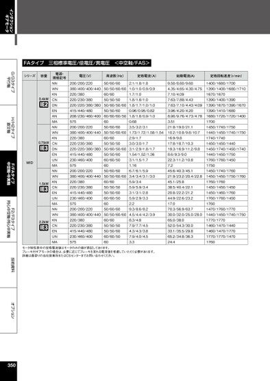 インダクションギアモータG/G3タイプ平行軸H/H2タイプ直交軸F/FAタイプ中空軸・中実軸F2/F3タイプ同心中空軸・同心中実軸技術資料オプションFAタイプ三相標準電圧/倍電圧/異電圧<中空軸/FAS>シリーズ容量0.4kW0.75kW1.5kW2.2kWMID電源・規格記号NNWNKNCNDNENANMANNWNKNCNDNENUNMANNWNKNCNENUNMANNWNKNCNENUNMA電圧(V)周波数(Hz)定格電流(A)始動電流(A)定格回転速度(r/min)200/200/220380/400/400/440220/380220/230/380220/220/380/380415/440/480208/230/460/400575200/200/220380/400/400/440220/380220/230/380220/220/380/380415/440/480230/460/400575200/200/220380/400/400/440220/380220/230/380415/440/480230/460/400575200/200/220380/400/400/440220/380220/230/380415/440/480230/460/40057550/60/6050/50/60/6060/6050/50/5050/60/50/6050/50/6060/60/60/506050/60/6050/50/60/6060/6050/50/5050/60/50/6050/50/6060/60/506050/60/6050/50/60/6060/6050/50/5050/50/6060/60/506050/60/6050/50/60/6060/6050/50/5050/50/6060/60/50602.1/1.8/1.81.0/1.0/0.9/0.91.7/1.01.8/1.8/1.01.8/1.7/1.0/1.00.96/0.95/0.821.8/1.8/0.9/1.00.683.5/3.2/3.11.73/1.72/1.58/1.542.9/1.73.0/3.0/1.73.1/2.9/1.8/1.71.54/1.52/1.363.1/1.5/1.71.166.7/6.1/5.93.4/3.4/3.1/3.05.9/3.45.9/5.9/3.43.1/3.1/2.85.9/2.9/3.32.29.3/8.6/8.24.5/4.4/4.2/3.98.3/4.87.9/7.7/4.54.3/4.3/3.87.9/4.0/4.53.39.50/8.60/9.604.35/4.65/4.30/4.757.10/4.097.63/7.88/4.437.63/7.10/4.43/4.093.96/4.20/4.208.90/9.76/4.73/4.783.5121.8/19.0/21.110.2/10.8/9.8/10.716.9/9.817.8/18.7/10.319.3/16.9/11.2/9.88.6/9.3/9.022.3/11.2/10.87.245.6/40.3/45.121.9/23.2/20.4/22.845.1/25.838.5/40.4/22.120.8/22.2/21.244.9/22.6/23.217.070.3/56.9/63.730.0/32.0/25.0/28.065.0/38.052.0/54.3/30.033.1/35.5/29.865.2/34.8/36.324.41400/1680/17001390/1400/1680/17101670/16701390/1400/13901390/1670/1390/16701390/1410/16801680/1720/1720/140017001450/1740/17501440/1450/1740/17501740/17401450/1450/14401450/1740/1450/17401440/1450/17501760/1760/145017501450/1740/17601450/1450/1750/17601760/17601450/1450/14501450/1460/17601760/1760/145017601470/1760/17701440/1450/1740/17501770/17701460/1470/14401460/1470/17701770/1770/14701760モータ特性表中の定格電流値はモータのみの値が表記してあります。ブレーキ付ギアモータの場合は、必要に応じてブレーキを流れる電流値を考慮していただく必要があります。詳細は最寄りの当社営業所またはCSセンターまでお問い合わせください。350