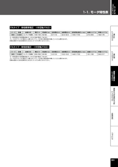 1-1.モータ特性表インダクションギアモータオプション技術資料F2/F3タイプ同心中空軸・同心中実軸F/FAタイプ中空軸・中実軸H/H2タイプ直交軸G/G3タイプ平行軸FAタイプ単相標準電圧<中空軸/FAS>シリーズ容量始動方式MID0.4kWコンデンサ始動電圧(V)100/100周波数(Hz)50/60定格電流(A)8.7/7.9始動電流(A)32.0/32.0モータ特性表中の定格電流値はモータのみの値が表記してあります。ブレーキ付ギアモータの場合は、必要に応じてブレーキを流れる電流値を考慮していただく必要があります。詳細は最寄りの当社営業所またはCSセンターまでお問い合わせください。FAタイプ単相倍電圧<中空軸/FAS>シリーズ容量始動方式MID0.4kWコンデンサ始動電圧(V)200/200周波数(Hz)50/60定格電流(A)4.3/3.9始動電流(A)19.0/18.0モータ特性表中の定格電流値はモータのみの値が表記してあります。ブレーキ付ギアモータの場合は、必要に応じてブレーキを流れる電流値を考慮していただく必要があります。詳細は最寄りの当社営業所またはCSセンターまでお問い合わせください。定格回転速度(r/min)始動トルク(%)停動トルク(%)1440/1730210/205189/178定格回転速度(r/min)始動トルク(%)停動トルク(%)1440/1730181/190240/217351