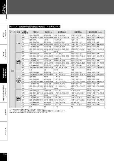 インダクションギアモータG/G3タイプ平行軸H/H2タイプ直交軸F/FAタイプ中空軸・中実軸F2/F3タイプ同心中空軸・同心中実軸技術資料オプションFタイプ三相標準電圧/倍電圧/異電圧<中実軸/FF>シリーズ容量MID0.1kW0.2kW0.4kW0.75kW電源・規格記号NNWNKNCNDNENANMANNWNKNCNDNENANMANNWNKNCNDNENANMANNWNKNCNDNENUNMA電圧(V)周波数(Hz)定格電流(A)始動電流(A)定格回転速度(r/min)200/200/220380/400/400/440220/380220/230/380220/220/380/380415/440/480208/230/460/400575200/200/220380/400/400/440220/380220/230/380220/220/380/380415/440/480208/230/460/400575200/200/220380/400/400/440220/380220/230/380220/220/380/380415/440/480208/230/460/400575200/200/220380/400/400/440220/380220/230/380220/220/380/380415/440/480230/460/40057550/60/6050/50/60/6060/6050/50/5050/60/50/6050/50/6060/60/60/506050/60/6050/50/60/6060/6050/50/5050/60/50/6050/50/6060/60/60/506050/60/6050/50/60/6060/6050/50/5050/60/50/6050/50/6060/60/60/506050/60/6050/50/60/6060/6050/50/5050/60/50/6050/50/6060/60/50600.61/0.54/0.540.31/0.31/0.28/0.280.52/0.300.55/0.54/0.310.55/0.52/0.31/0.300.30/0.29/0.260.54/0.57/0.29/0.310.201.1/1.0/1.00.56/0.56/0.50/0.500.93/0.520.99/0.98/0.560.99/0.93/0.56/0.520.50/0.50/0.451.0/1.0/0.50/0.560.402.1/1.8/1.81.0/1.0/0.9/0.91.7/1.01.8/1.8/1.01.8/1.7/1.0/1.00.96/0.95/0.821.8/1.8/0.9/1.00.683.5/3.2/3.11.73/1.72/1.58/1.542.9/1.73.0/3.0/1.73.1/2.9/1.8/1.71.54/1.52/1.363.1/1.5/1.71.162.39/2.27/2.521.12/1.18/1.12/1.221.90/1.101.94/2.03/1.121.94/1.90/1.12/1.101.06/1.12/1.172.35/2.62/1.26/1.210.874.70/4.35/4.852.29/2.38/2.29/2.483.70/2.203.97/4.15/2.293.97/3.70/2.29/2.201.75/1.86/2.004.78/5.16/2.56/2.441.789.50/8.60/9.604.35/4.65/4.30/4.757.10/4.097.63/7.88/4.437.63/7.10/4.43/4.093.96/4.20/4.208.90/9.76/4.73/4.783.5121.8/19.0/21.110.2/10.8/9.8/10.716.9/9.817.8/18.7/10.319.3/16.9/11.2/9.88.6/9.3/9.022.3/11.2/10.87.21410/1690/17101400/1410/1690/17201680/16801400/1410/14001400/1680/1400/16801390/1420/17201690/1730/1730/141017001400/1680/17001390/1400/1680/17101680/16801400/1410/13901400/1680/1390/16801370/1400/17001680/1720/1720/140017101400/1680/17001390/1400/1680/17101670/16701390/1400/13901390/1670/1390/16701390/1410/16801680/1720/1720/140017001450/1740/17501440/1450/1740/17501740/17401450/1450/14401450/1740/1450/17401440/1450/17501760/1760/14501750モータ特性表中の定格電流値はモータのみの値が表記してあります。ブレーキ付ギアモータの場合は、必要に応じてブレーキを流れる電流値を考慮していただく必要があります。詳細は最寄りの当社営業所またはCSセンターまでお問い合わせください。352