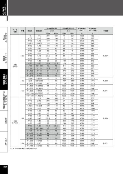 インダクションギアモータG/G3タイプ平行軸H/H2タイプ直交軸F/FAタイプ中空軸・中実軸F2/F3タイプ同心中空軸・同心中実軸技術資料オプションモータ容量三相0.4kW三相0.75kW枠番減速比実減速比r/minN・m出力軸回転速度出力軸許容トルク出力軸許容O.H.L.出力軸許容スラスト荷重寸法図1/51/7.51/101/52/151/101/12.519/2351/151/201/251/301/401/501/601/801/1001/120※1/160※1/200※1/2401/3001/375※1/450※1/600※1/750※1/900※1/1200※1/15001/51/7.51/101/151/201/251/301/401/501/601/8019/18801/1201/1601/2001/2407/2080133/488807/312049/2860011/83207/613649/5720011/166401/52/151/101/12.519/2351/151/201/251/301/401/501/601/801/1001/120※1/160※1/200※1/240※1/300※1/375※1/4501/151/201/251/301/401/501/601/8019/18801/1201/1601/2001/2407/21201/3717/3180354555455550Hz30020015012010075605037.5302518.81512.59.47.56.3543.32.521.71.3130020015012010075605037.5302518.81512.59.47.56.3543.360Hz36024018014412090726045363022.5181511.397.564.8432.421.51.236024018014412090726045363022.5181511.397.564.8450Hz1117232733445567881111331692112532702702705657077131030103010301030103021314152638310412416620824931639547355455455410301030103060Hz9.214192427374655749211114017521127027027047158970789110301030103010301825344352708610413817320826332839552655455488310301030N196022502450260027402990319032803480348034803480353035303630363036305190519051909800980098009800980029403330363039204070446047004750475047504750475047504750519051905190980098009800N490569618647686745794824873873873873883883912912912127512751275245224522452245224527358349129801030107911771177117711771177117711771177127512751275245224522452P.367P.369P.371P.369P.371注1.P.353の注意事項を必ずお読みください。354