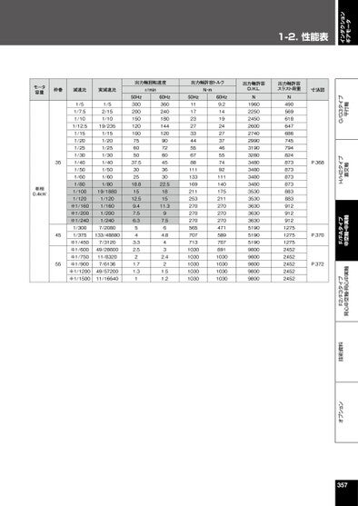1-2.性能表インダクションギアモータオプション技術資料F2/F3タイプ同心中空軸・同心中実軸F/FAタイプ中空軸・中実軸H/H2タイプ直交軸G/G3タイプ平行軸モータ容量単相0.4kW枠番減速比実減速比r/minN・m出力軸回転速度出力軸許容トルク出力軸許容O.H.L.出力軸許容スラスト荷重寸法図1/51/7.51/101/52/151/101/12.519/2351/151/201/251/301/401/501/601/801/1001/120※1/160※1/200※1/2401/3001/375※1/450※1/600※1/750※1/900※1/1200※1/15001/151/201/251/301/401/501/601/8019/18801/1201/1601/2001/2407/2080133/488807/312049/2860011/83207/613649/5720011/1664035455550Hz30020015012010075605037.5302518.81512.59.47.56.3543.32.521.71.3160Hz36024018014412090726045363022.5181511.397.564.8432.421.51.250Hz1117232733445567881111331692112532702702705657077131030103010301030103060Hz9.21419242737465574921111401752112702702704715897078911030103010301030N1960225024502600274029903190328034803480348034803530353036303630363051905190519098009800980098009800N49056961864768674579482487387387387388388391291291212751275127524522452245224522452P.368P.370P.372357