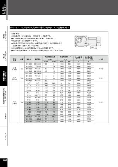 インダクションギアモータG/G3タイプ平行軸H/H2タイプ直交軸F/FAタイプ中空軸・中実軸F2/F3タイプ同心中空軸・同心中実軸技術資料オプションFAタイプギアモータ・ブレーキ付ギアモータ<中空軸/FAS>【注意事項】●寸法図内カッコ()の値はブレーキ付ギアモータの表示です。●出力軸回転速度はモータ同期回転速度と減速比に対する値です。●出力軸のキー材は付属されていません。●性能表内はP.545に示した結線(正転)の場合、フランジ面側より見て右回転であることを示します。右図参照)●出力軸許容O.H.L.は、出力軸端面より20mmの位置の値です。●※印はトルク制限機種です。性能表の出力軸許容トルクに特にご注意ください。枠番減速比実減速比r/minN・m出力軸回転速度出力軸許容トルク出力軸許容O.H.L.出力軸許容スラスト荷重寸法図P.373P.373P.37350Hz60Hz2.521.71.31543.330020015012010075605037.5302518.81512.59.47.56.332.421.51.264.8436024018014412090726045363022.5181511.397.550Hz1030103010301030103010301030103041638310412416620824933241649863178994710301030103060Hz89110301030103010308831030103034527086104138173208276345416526658789103010301030N9800980098009800980098009800980047005340578061306320632063206320632063206320642064207500833090209800N2452245224522452245224522452245211771324142215201569156915691569156915691569161816181863205922562452モータ容量三相0.4kW三相0.75kW※1/600※1/750※1/900※1/1200※1/1500※1/300※1/375※1/45049/2860011/83207/613649/5720011/166407/21201/3717/31805555三相1.5kW551/51/7.51/101/12.51/151/201/251/301/401/501/601/801/1001/120※1/160※1/200※1/2401/52/151/104/491/1514/27511/2802/591/401/491/607/55011/11201/1187/110011/22401/236358