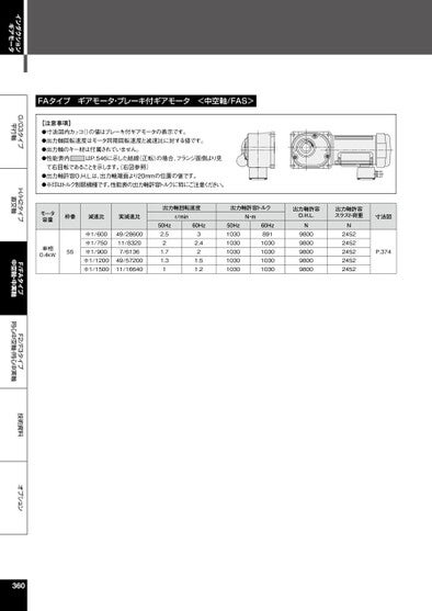 インダクションギアモータG/G3タイプ平行軸H/H2タイプ直交軸F/FAタイプ中空軸・中実軸F2/F3タイプ同心中空軸・同心中実軸技術資料オプションFAタイプギアモータ・ブレーキ付ギアモータ<中空軸/FAS>【注意事項】●寸法図内カッコ()の値はブレーキ付ギアモータの表示です。●出力軸回転速度はモータ同期回転速度と減速比に対する値です。●出力軸のキー材は付属されていません。●性能表内はP.546に示した結線(正転)の場合、フランジ面側より見て右回転であることを示します。右図参照)●出力軸許容O.H.L.は、出力軸端面より20mmの位置の値です。●※印はトルク制限機種です。性能表の出力軸許容トルクに特にご注意ください。50Hz60Hz※1/600※1/750※1/900※1/1200※1/150049/2860011/83207/613649/5720011/166402.521.71.3132.421.51.250Hz1030103010301030103060Hz8911030103010301030N98009800980098009800N24522452245224522452P.374枠番減速比実減速比r/minN・m出力軸回転速度出力軸許容トルク出力軸許容O.H.L.出力軸許容スラスト荷重寸法図モータ容量単相0.4kW55360
