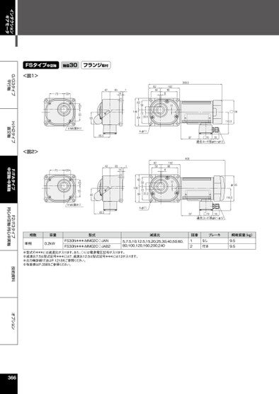 インダクションギアモータG/G3タイプ平行軸H/H2タイプ直交軸F/FAタイプ中空軸・中実軸F2/F3タイプ同心中空軸・同心中実軸技術資料オプションFSタイプ中空軸軸径30フランジ取付<図1>73334265114335565115φ4-M8深さ1785.5<図2>733342651413355115φ654-M8深さ1785.5389.562501029081162501029081197400976214650728433.34-φ116250146847233.34-φ11□7035適合コード径φ8~φ12□126116.5φ135116.5□7035適合コード径φ8~φ12相数容量単相0.2kW型式FS30N***-MM02C◇JANFS30N***-MM02C◇JAB2減速比5,7.5,10,12.5,15,20,25,30,40,50,60,80,100,120,160,200,240図番12ブレーキ概略質量(kg)なし付き9.59.5※型式の***には減速比が入ります。また、◇には電源電圧記号が入ります。※減速比7.5は型式記号***には7、減速比12.5は型式記号***には12が入ります。※出力軸詳細寸法はP.1218をご参照ください。※性能表はP.356をご参照ください。366