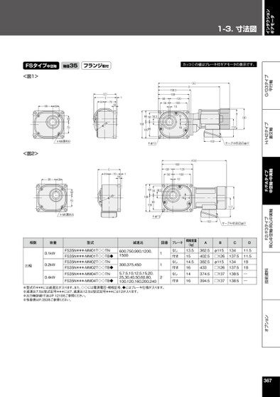 1-3.寸法図インダクションギアモータオプション技術資料F2/F3タイプ同心中空軸・同心中実軸F/FAタイプ中空軸・中実軸H/H2タイプ直交軸G/G3タイプ平行軸FSタイプ中空軸軸径35フランジ取付カッコ()の値はブレーキ付ギアモータの表示です。<図1><図2>903838704-M8深さ20903838704-M8深さ20(C)C4470161821φC4470161821φ(A)A198.5188120108106856D16(A)A68561881201081016685638.3168881004-φ13685638.3168881004-φ13B(B)110102ケーブル引込口φ27B117102ケーブル引込口φ27相数容量型式減速比図番ブレーキ三相0.1kW0.2kW0.4kWFS35N***-MM01T◇◇TNFS35N***-MM01T◇◇TB◆FS35N***-MM02T◇◇TNFS35N***-MM02T◇◇TB◆FS35N***-MM04T◇◇TNFS35N***-MM04T◇◇TB◆600,750,900,1200,1500300,375,4505,7.5,10,12.5,15,20,25,30,40,50,60,80,100,120,160,200,240112なし付きなし付きなし付き※型式の***には減速比が入ります。また、◇◇には電源電圧・規格記号、◆にはブレーキ仕様が入ります。※減速比7.5は型式記号***には7、減速比12.5は型式記号***には12が入ります。※出力軸詳細寸法はP.1218をご参照ください。※性能表はP.353をご参照ください。概略質量(kg)13.51514.5161416ABC362.5402.5382.5433374.5394.5φ115□126φ115□126□137□137134137.5134137.5138.5138.5D11.511.51818――367