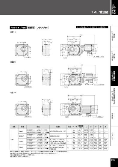 1-3.寸法図インダクションギアモータオプション技術資料F2/F3タイプ同心中空軸・同心中実軸F/FAタイプ中空軸・中実軸H/H2タイプ直交軸G/G3タイプ平行軸FASタイプ中空軸軸径55フランジ取付カッコ()の値はブレーキ付ギアモータの表示です。<図1><図2><図3>13658180.57098122581004-M12深さ2213658581004-M12深さ221109059.32621321524-φ181109059.32621521324-φ18122180.5709813658E7098122(A)Aφ165312.529818816816110902121B117102ケーブル引込口φ27312.529818816816(A)Aφ1653021B12868.5102ケーブル引込口φ27(A)A312.5298188168161109011090581004-M12深さ221109059.326213215221BC4-φ18D102ケーブル引込口φ27相数容量型式減速比図番ブレーキ三相0.4kW0.75kW1.5kW2.2kWFAS55N***-MM04T◇◇TNFAS55N***-MM04T◇◇TB◆FAS55N***-MR08T◇◇TNFAS55N***-MR08T◇◇TB◆FAS55N***-MR15T◇◇TNFAS55N***-MR15T◇◇TB◆FAS55N***-MR22T◇◇TNFAS55N***-MR22T◇◇TB◆600,750,900,1200,1500300,375,4505,7.5,10,12.5,15,20,25,30,40,50,60,80,100,120,160,200,2405,7.5,10,12.5,15,20,25,30,40,50,60,80,100,1201233なし付きなし付きなし付きなし付き※型式の***には減速比が入ります。また、◇◇には電源電圧・規格記号、◆にはブレーキ仕様が入ります。※減速比7.5は型式記号***には7、減速比12.5は型式記号***には12が入ります。※出力軸詳細寸法はP.1218をご参照ください。※性能表はP.358をご参照ください。概略質量(kg)42.744.250.753.256.759.767.270.2ABCDE547.5567.5600619565594□137□137□154□154□178□178614.5□192643.5□192――――139139149149――――9191140140――――187187194194373