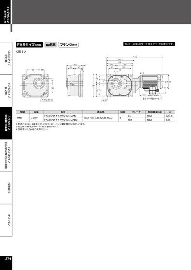 インダクションギアモータG/G3タイプ平行軸H/H2タイプ直交軸F/FAタイプ中空軸・中実軸F2/F3タイプ同心中空軸・同心中実軸技術資料オプションFASタイプ中空軸軸径55フランジ取付カッコ()の値はブレーキ付ギアモータの表示です。<図1>13658180.5709812211090312.529818816816(A)Aφ14458100φ1654-M12深さ2211059.3902621521324-φ182121φ162131.5110.5□7035適合コード径φ8~φ12相数容量単相0.4kW型式減速比図番ブレーキ概略質量(kg)AFAS55N***-MM04C◇JANFAS55N***-MM04C◇JAB2600,750,900,1200,15001なし付き48.248.2627.5636※型式の***には減速比が入ります。また、◇には電源電圧記号が入ります。※出力軸詳細寸法はP.1218をご参照ください。※性能表はP.360をご参照ください。374