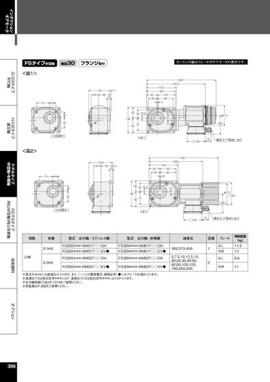 インダクションギアモータG/G3タイプ平行軸H/H2タイプ直交軸F/FAタイプ中空軸・中実軸F2/F3タイプ同心中空軸・同心中実軸技術資料オプションFSタイプ中空軸軸径30フランジ取付カッコ()の値はブレーキ付ギアモータの表示です。<図1><図2>733333554-M8深さ17733333554-M8深さ17(397)335.5170.5164102908625015.511(391)300.56250164102908111123426514511φ132.54265141511φ625033.314672844-φ11625033.314672844-φ11φ115108.2□10535適合コード径φ8~φ12φ115□126108.2□10535適合コード径φ8~φ12相数容量型式出力軸:ステンレス鋼型式出力軸:炭素鋼減速比図番ブレーキ三相0.1kW0.2kWFS30S***-WM01T◇◇ENFS30S***-WM01T◇◇EV◆FS30N***-WM01T◇◇ENFS30N***-WM01T◇◇EV◆FS30S***-WM02T◇◇ENFS30N***-WM02T◇◇ENFS30S***-WM02T◇◇EV◆FS30N***-WM02T◇◇EV◆300,375,4505,7.5,10,12.5,15,20,25,30,40,50,60,80,100,120,160,200,24012なし付きなし付き概略質量(kg)11.5139.511※型式の***には減速比が入ります。また、◇◇には電源電圧・規格記号、◆にはブレーキ仕様が入ります。※減速比7.5は型式記号***には7、減速比12.5は型式記号***には12が入ります。※出力軸詳細寸法はP.1218をご参照ください。※性能表はP.380をご参照ください。386