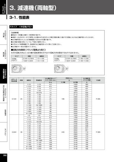 インダクションギアモータG/G3タイプ平行軸H/H2タイプ直交軸F/FAタイプ中空軸・中実軸F2/F3タイプ同心中空軸・同心中実軸技術資料オプション3.減速機(両軸型)3-1.性能表Fタイプ<中空軸/FS>【注意事項】●相当モータ容量は4極モータ使用時の値です。●4極モータ以外のモータでご使用になる場合はP.623のトルク補正係数を乗じた値がその回転における出力軸許容トルクになります。●出力軸許容O.H.L.は、出力軸端面より20mmの位置の値です。●出力軸の回転方向については、下図をご参照ください。●※印はトルク制限機種です。性能表の出力軸許容トルクに特にご注意ください。●出力軸のキー材は付属されていません。■回転方向関係(フランジ面側より見て)矢印の回転方向は入・出力軸の回転関係を示すもので回転方向を限定するものではありません。タイプ中空軸/FSタイプ容量0.1kW~0.75kW1.5kW~2.2kW減速比1/5~1/601/5~1/30タイプ中空軸/FSタイプ容量減速比0.1kW~0.75kW1.5kW~2.2kW1/80~1/2401/40~1/2404Pモータ相当容量枠番減速比実減速比0.1kW250.2kW301/101/12.51/151/201/251/301/401/501/601/801/1001/1201/1601/200※1/2401/51/7.51/101/12.51/151/201/251/301/401/501/601/801/1001/1201/160※1/200※1/2401/102/251/151/2019/4701/301/401/501/601/8019/18801/1201/1601/2001/2401/52/151/1019/2351/151/201/251/301/401/501/601/8019/18801/1201/1601/2001/240出力軸許容トルク入力(1500r/min)N・m5.26.57.711131621253139495978981015.58.311141723273344556784105126169184184許容O.H.L.N入力軸196245出力軸15201620172018602010211023002450255025502550255025502550255015201760191020602160240025502650284029903090309031403140314031403140出力軸許容スラスト荷重寸法図N382402431471500530579618637637637637637637637382441481520539598637667716745775775785785785785785P.395P.395392