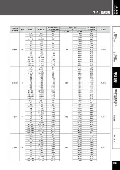 3-1.性能表インダクションギアモータオプション技術資料F2/F3タイプ同心中空軸・同心中実軸F/FAタイプ中空軸・中実軸H/H2タイプ直交軸G/G3タイプ平行軸4Pモータ相当容量枠番減速比実減速比0.4kW350.75kW451.5kW552.2kW551/51/7.51/101/12.51/151/201/251/301/401/501/601/801/1001/120※1/160※1/200※1/240※1/160※1/200※1/2401/51/7.51/101/12.51/151/201/251/301/401/501/601/801/1001/1201/51/7.51/101/12.51/151/201/251/301/401/501/601/801/1001/120※1/160※1/200※1/2401/51/7.51/101/12.51/151/201/251/301/401/501/601/80※1/100※1/12019/18801/151/201/251/301/401/501/601/801/1201/1601/2001/2401/52/151/104/491/1519/2351/52/151/101/151/201/251/301/401/501/601/8019/18801/1201/1601/2001/2401/52/151/1019/23514/27511/2802/591/401/491/607/55011/11201/1187/110011/22401/2361/52/151/104/491/1514/27511/2802/591/401/491/607/55011/11201/118出力軸許容トルク入力(1500r/min)N・m111723273344556788111133169211253270270270213141526383104124166208249316395473554554554416383104124166208249332416498631789947103010301030619112215218224430536648760973192610301030許容O.H.L.N入力軸294392392392寸法図P.396P.396P.397P.397出力軸許容スラスト荷重N49056961864768674579482487387387387388388391291291273583491298010301079117711771177117711771177117711771275127512751177132414221520156915691569156915691569156916181618186320592256245211771324142215201569156915691569156915691569161816181863出力軸19602250245026002740299031903280348034803480348035303530363036303630294033303630392040704460470047504750475047504750475047505190519051904700534057806130632063206320632063206320632064206420750083309020980047005340578061306320632063206320632063206320642064207500393