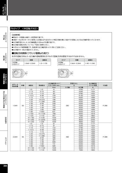 インダクションギアモータG/G3タイプ平行軸H/H2タイプ直交軸F/FAタイプ中空軸・中実軸F2/F3タイプ同心中空軸・同心中実軸技術資料オプションFAタイプ<中空軸/FAS>【注意事項】●相当モータ容量は4極モータ使用時の値です。●4極モータ以外のモータでご使用になる場合はP.623のトルク補正係数を乗じた値がその回転における出力軸許容トルクになります。●出力軸許容O.H.L.は、出力軸端面より20mmの位置の値です。●出力軸の回転方向については、下図をご参照ください。●※印はトルク制限機種です。性能表の出力軸許容トルクに特にご注意ください。●出力軸のキー材は付属されていません。■回転方向関係(フランジ面側より見て)矢印の回転方向は入・出力軸の回転関係を示すもので回転方向を限定するものではありません。タイプ中空軸/FASタイプ容量減速比1.5kW~2.2kW1/5~1/30タイプ中空軸/FASタイプ容量減速比1.5kW~2.2kW1/40~1/240出力軸許容トルク入力(1500r/min)N・m416383104124166208249332416498631789947103010301030619112215218224430536648760973192610301030許容O.H.L.N入力軸392392寸法図P.398P.398出力軸許容スラスト荷重N1177132414221520156915691569156915691569156916181618186320592256245211771324142215201569156915691569156915691569161816181863出力軸47005340578061306320632063206320632063206320642064207500833090209800470053405780613063206320632063206320632063206420642075004Pモータ相当容量枠番減速比実減速比1/51/7.51/101/12.51/151/201/251/301/401/501/601/801/1001/120※1/160※1/200※1/2401/51/7.51/101/12.51/151/201/251/301/401/501/601/80※1/100※1/1201/52/151/104/491/1514/27511/2802/591/401/491/607/55011/11201/1187/110011/22401/2361/52/151/104/491/1514/27511/2802/591/401/491/607/55011/11201/1181.5kW552.2kW55394