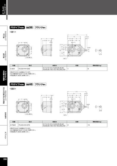 インダクションギアモータG/G3タイプ平行軸H/H2タイプ直交軸F/FAタイプ中空軸・中実軸F2/F3タイプ同心中空軸・同心中実軸技術資料オプションFSタイプ中空軸軸径35フランジ取付<図1>1341447016821φ6838.356168881004-φ13277188120108106856163027φ15h6517減速比図番概略質量(kg)5,7.5,10,12.5,15,20,25,30,40,50,60,80,100,120,160,200,24019903838704-M8深さ20容量型式0.4kWFS-35-***-040※型式の***には減速比が入ります。※出力軸詳細寸法はP.1218をご参照ください。※性能表はP.393をご参照ください。FSタイプ中空軸軸径45フランジ取付<図2>1515180181241φ857048.82041191044-φ15331.5234149134148570173532φ20h6622.5減速比図番概略質量(kg)5,7.5,10,12.5,15,20,25,30,40,50,60,80,100,120,160,200,2402151124848824-M10深さ25容量型式0.75kWFS-45-***-075※型式の***には減速比が入ります。※出力軸詳細寸法はP.1218をご参照ください。※性能表はP.393をご参照ください。396