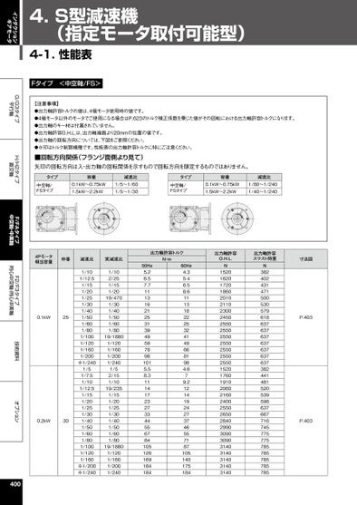 インダクションギアモータG/G3タイプ平行軸H/H2タイプ直交軸F/FAタイプ中空軸・中実軸F2/F3タイプ同心中空軸・同心中実軸技術資料オプション4.S型減速機(指定モータ取付可能型)4-1.性能表Fタイプ<中空軸/FS>【注意事項】●出力軸許容トルクの値は、4極モータ使用時の値です。●4極モータ以外のモータでご使用になる場合はP.623のトルク補正係数を乗じた値がその回転における出力軸許容トルクになります。●出力軸のキー材は付属されていません。●出力軸許容O.H.L.は、出力軸端面より20mmの位置の値です。●出力軸の回転方向については、下図をご参照ください。●※印はトルク制限機種です。性能表の出力軸許容トルクに特にご注意ください。■回転方向関係(フランジ面側より見て)矢印の回転方向は入・出力軸の回転関係を示すもので回転方向を限定するものではありません。タイプ中空軸/FSタイプ容量0.1kW~0.75kW1.5kW~2.2kW減速比1/5~1/601/5~1/30タイプ中空軸/FSタイプ容量減速比0.1kW~0.75kW1.5kW~2.2kW1/80~1/2401/40~1/2404Pモータ相当容量枠番減速比実減速比出力軸許容トルクN・m50Hz60Hz0.1kW250.2kW301/101/12.51/151/201/251/301/401/501/601/801/1001/1201/1601/200※1/2401/51/7.51/101/12.51/151/201/251/301/401/501/601/801/1001/1201/160※1/200※1/2401/102/251/151/2019/4701/301/401/501/601/8019/18801/1201/1601/2001/2401/52/151/1019/2351/151/201/251/301/401/501/601/8019/18801/1201/1601/2001/2405.26.57.711131621253139495978981015.58.3111417232733445567841051261691841844.35.46.58.611131822253241496681984.679.212141924273746557187105140175184400出力軸許容O.H.L.出力軸許容スラスト荷重寸法図N15201620172018602010211023002450255025502550255025502550255015201760191020602160240025502650284029903090309031403140314031403140N382402431471500530579618637637637637637637637382441481520539598637667716745775775785785785785785P.403P.403