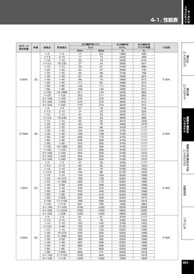 4-1.性能表インダクションギアモータオプション技術資料F2/F3タイプ同心中空軸・同心中実軸F/FAタイプ中空軸・中実軸H/H2タイプ直交軸G/G3タイプ平行軸4Pモータ相当容量枠番減速比実減速比出力軸許容トルクN・m1/51/7.51/101/12.51/151/201/251/301/401/501/601/801/1001/120※1/160※1/200※1/240※1/160※1/200※1/2401/51/7.51/101/12.51/151/201/251/301/401/501/601/801/1001/1201/51/7.51/101/12.51/151/201/251/301/401/501/601/801/1001/120※1/160※1/200※1/2401/51/7.51/101/12.51/151/201/251/301/401/501/601/800.4kW350.75kW451.5kW552.2kW5519/2351/52/151/101/151/201/251/301/401/501/601/8019/18801/1201/1601/2001/2401/52/151/1019/23519/18801/151/201/251/301/401/501/601/801/1201/1601/2001/2401/52/151/104/491/1514/27511/2802/591/401/491/607/55011/11201/1187/110011/22401/2361/52/151/104/491/1514/27511/2802/591/401/491/607/55050Hz11172327334455678811113316921125327027027021314152638310412416620824931639547355455455441638310412416620824933241649863178994710301030103061911221521822443053664876097319261030103060Hz9.2141924273746557492111140175211270270270182534435270861041381732082633283955265545543452708610413817320827634541652665878910301030103051761021261522032543054065086097719641030寸法図P.404P.404P.405P.405出力軸許容O.H.L.出力軸許容スラスト荷重N19602250245026002740299031903280348034803480348035303530363036303630294033303630392040704460470047504750475047504750475047505190519051904700534057806130632063206320632063206320632064206420750083309020980047005340578061306320632063206320632063206320642064207500N49056961864768674579482487387387387388388391291291273583491298010301079117711771177117711771177117711771275127512751177132414221520156915691569156915691569156916181618186320592256245211771324142215201569156915691569156915691569161816181863401※1/100※1/12011/11201/118