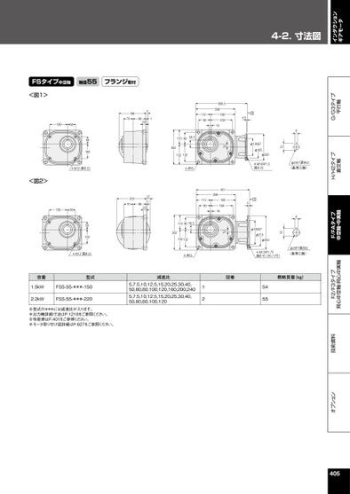 4-2.寸法図インダクションギアモータオプション技術資料F2/F3タイプ同心中空軸・同心中実軸F/FAタイプ中空軸・中実軸H/H2タイプ直交軸G/G3タイプ平行軸FSタイプ中空軸軸径55フランジ取付<図1><図2>13658581004-M12深さ2213658581004-M12深さ221987029822111090388.529818816816211109059.3262152132φ184-S4.5827φ24F7深さ52(基準□面)Sφ130G7φ165φ2004-M10XP1.5深さ252237098271222984011881681611090S51109059.3262152132φ184-21φ180G7φ215φ250314-M12XP1.75深さ(カンツウ)168φ28F7深さ62(基準□面)S容量型式1.5kWFSS-55-***-1502.2kWFSS-55-***-220※型式の***には減速比が入ります。※出力軸詳細寸法はP.1218をご参照ください。※性能表はP.401をご参照ください。※モータ取り付け部詳細はP.627をご参照ください。減速比図番概略質量(kg)5,7.5,10,12.5,15,20,25,30,40,50,60,80,100,120,160,200,2405,7.5,10,12.5,15,20,25,30,40,50,60,80,100,120125455405