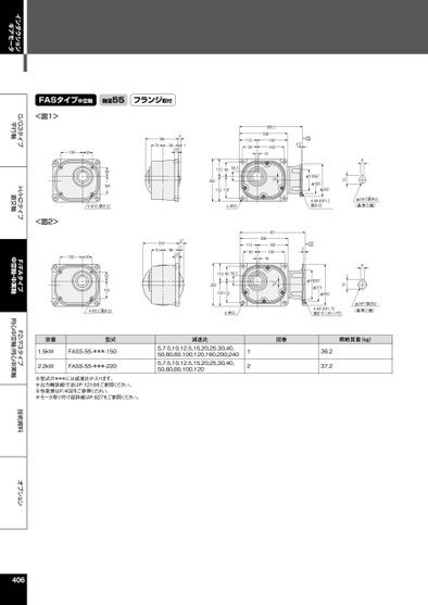 インダクションギアモータG/G3タイプ平行軸H/H2タイプ直交軸F/FAタイプ中空軸・中実軸F2/F3タイプ同心中空軸・同心中実軸技術資料オプションFASタイプ中空軸軸径55フランジ取付<図1><図2>13658581004-M12深さ2213658581004-M12深さ221987029822111090388.529818816816211109059.3262152132φ184-S4.5827φ24F7深さ52(基準□面)Sφ130G7φ165φ2004-M10XP1.5深さ252237098271222984011881681611090S51109059.3262152132φ184-21φ180G7φ215φ250314-M12XP1.75深さ(カンツウ)168φ28F7深さ62(基準□面)S容量型式1.5kWFASS-55-***-1502.2kWFASS-55-***-220※型式の***には減速比が入ります。※出力軸詳細寸法はP.1218をご参照ください。※性能表はP.402をご参照ください。※モータ取り付け部詳細はP.627をご参照ください。減速比図番概略質量(kg)5,7.5,10,12.5,15,20,25,30,40,50,60,80,100,120,160,200,2405,7.5,10,12.5,15,20,25,30,40,50,60,80,100,1201236.237.2406