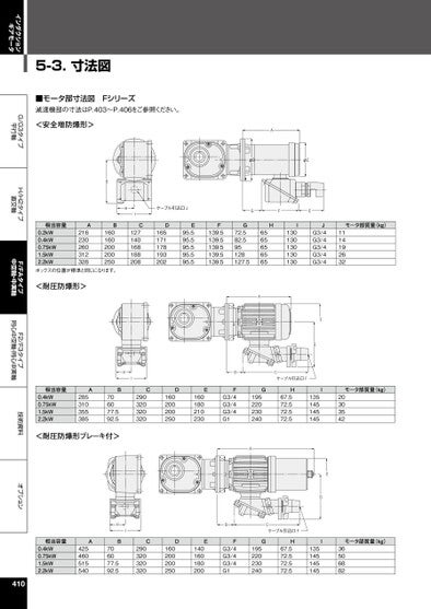 G/G3タイプ平行軸H/H2タイプ直交軸F/FAタイプ中空軸・中実軸F2/F3タイプ同心中空軸・同心中実軸技術資料オプションインダクションギアモータ5-3.⼨法図■モータ部寸法図Fシリーズ減速機部の寸法はP.403~P.406をご参照ください。<安全増防爆形>AφBφCDB160160200200250相当容量0.2kW0.4kW0.75kW1.5kW2.2kWA216230260312328ボックスの位置が標準と同じになります。<耐圧防爆形>HIC127140168188208ケーブル引込口JD165171178193202E95.595.595.595.595.5GFEF139.5139.5139.5139.5139.5G72.582.595128127.5H6565656565I130130130130130JG3/4G3/4G3/4G3/4G3/4モータ部質量(kg)1114192632DBHI相当容量A0.4kW0.75kW1.5kW2.2kW285310355385B706077.592.5CDE290320320320160200200250160180210230FG3/4G3/4G3/4G1<耐圧防爆形ブレーキ付>AG195220230240AG135145145145Cケーブル引込口FH67.572.572.572.5EIGIEモータ部質量(kg)20303542モータ部質量(kg)13514514514536506882DBCDE290320320320160200200250140160180200FG3/4G3/4G3/4G1Cケーブル引込口FG195220230240H67.572.572.572.5相当容量A0.4kW0.75kW1.5kW2.2kW425460515540IHB706077.592.5410
