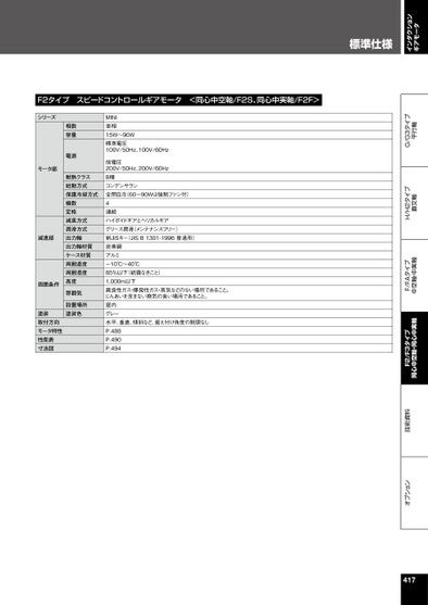インダクションギアモータ標準仕様オプション技術資料F2/F3タイプ同心中空軸・同心中実軸F/FAタイプ中空軸・中実軸H/H2タイプ直交軸G/G3タイプ平行軸F2タイプスピードコントロールギアモータ<同心中空軸/F2S、同心中実軸/F2F>シリーズモータ部相数容量電源耐熱クラス始動方式保護冷却方式極数定格減速方式潤滑方式出力軸出力軸材質ケース材質周囲温度周囲湿度高度雰囲気設置場所塗装色減速部周囲条件塗装取付方向モータ特性性能表寸法図MINI単相15W~90W標準電圧100V/50Hz、100V/60Hz倍電圧200V/50Hz、200V/60HzB種コンデンサラン全閉自冷(60~90Wは強制ファン付)4連続ハイポイドギアとヘリカルギアグリース潤滑(メンテナンスフリー)新JISキー(JISB1301-1996普通形)炭素鋼アルミ-10℃~40℃85%以下(結露なきこと)1,000m以下腐食性ガス・爆発性ガス・蒸気などのない場所であること。じんあいを含まない換気の良い場所であること。屋内グレー水平、垂直、傾斜など、据え付け角度の制限なしP.488P.490P.494417
