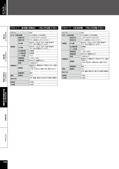 インダクションギアモータG/G3タイプ平行軸H/H2タイプ直交軸F/FAタイプ中空軸・中実軸F2/F3タイプ同心中空軸・同心中実軸技術資料オプションF3タイプ減速機(両軸型)<同心中空軸/F3S>F3タイプS型減速機<同心中空軸/F3S>シリーズ4Pモータ相当容量減速方式潤滑方式出力軸入力軸出力軸材質入力軸材質ケース材質周囲温度周囲湿度高度雰囲気設置場所塗装色減速部周囲条件塗装取付方向性能表寸法図MID0.1kW相当~2.2kW相当ハイポイドギアとヘリカルギアグリース潤滑(メンテナンスフリー)新JISキー(JISB1301-1996普通形)※キー材は付属されていません。新JISキー(JISB1301-1996普通形)※キー材は付属されていません。炭素鋼炭素鋼アルミ-10℃~40℃85%以下(結露なきこと)1,000m以下腐食性ガス・爆発性ガス・蒸気などのない場所であること。じんあいを含まない換気の良い場所であること。屋内グレー水平、垂直、傾斜など、据え付け角度の制限なしP.498P.500シリーズ4Pモータ相当容量減速方式潤滑方式減速部出力軸出力軸材質ケース材質周囲温度周囲湿度高度雰囲気設置場所塗装色周囲条件塗装取付方向性能表寸法図MID0.1kW相当~2.2kW相当ハイポイドギアとヘリカルギアグリース潤滑(メンテナンスフリー)新JISキー(JISB1301-1996普通形)※キー材は付属されていません。炭素鋼アルミ-10℃~40℃85%以下(結露なきこと)1,000m以下腐食性ガス・爆発性ガス・蒸気などのない場所であること。じんあいを含まない換気の良い場所であること。屋内グレー水平、垂直、傾斜など、据え付け角度の制限なしP.504P.506418