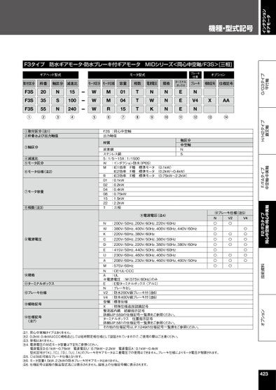 機種・型式記号インダクションギアモータオプション技術資料F2/F3タイプ同心中空軸・同心中実軸F/FAタイプ中空軸・中実軸H/H2タイプ直交軸G/G3タイプ平行軸F3タイプ防水ギアモータ・防水ブレーキ付ギアモータMIDシリーズ<同心中空軸/F3S>[三相]オプション補助記号仕様記号X⑬AA⑭ブレーキ仕様ブレーキNV4N⑫ターミナルボックスEEE⑪取付区分枠番軸区分減速比モータ区分モータ仕様容量相数電源電圧規格NNN⑩NWK⑨TTT⑧010415⑦MMR⑥WWW⑤15100240④NSN③F3SF3SF3S①203555②ギアヘッド型式モータ型式①取付区分(注1)②枠番および出力軸径③軸区分④減速比⑤モータ区分⑥モータ仕様(注2)⑦モータ容量⑧相数(注3)⑨電源電圧⑩規格⑪ターミナルボックス⑫ブレーキ仕様⑬補助記号⑭仕様記号(注7)軸区分中空軸NSF3S:同心中空軸出力軸径材質炭素鋼ステンレス鋼5:1/5~15X:1/1500WM:インダクション防水(IP65):IE1効率F種標準モータ(0.1kW)IE2効率F種標準モータ(0.2kW~0.4kW):IE3効率F種標準モータ(0.75kW~2.2kW):0.1kW:0.2kW:0.4kW:0.75kW:1.5kW:2.2kW:三相R010204081522TV2〇⑫ブレーキ仕様(注5)NV4〇〇〇〇〇〇〇〇〇〇〇〇〇〇〇〇〇〇〇〇〇〇⑨電源電圧(注4):200V/50Hz、200V/60Hz、220V/60Hz:380V/50Hz、400V/50Hz、400V/60Hz、440V/60Hz:220V/60Hz、380V/60Hz:220V/50Hz、230V/50Hz、380V/50Hz:220V/50Hz、220V/60Hz、380V/50Hz、380V/60Hz:415V/50Hz、440V/50Hz、480V/60Hz:230V/60Hz、460V/60Hz、400V/50Hz:208V/60Hz、230V/60Hz、460V/60Hz、400V/50Hz:575V/60Hz:CE・UL・CCC:ULNWKCDEUAMNA※電源電圧:M(575V/60Hz)のみENV2V4空欄:標準仕様X整流器内蔵結線指示記号詳細はP.559の仕様記号一覧表をご参照ください。ターミナルボックス位置指示記号詳細はP.581の仕様記号一覧表をご参照ください。その他の仕様記号は、P.1249の仕様記号一覧表をご参照ください。:E型ターミナルボックス(アルミ):ブレーキなし:防水200V級ブレーキ付(注6):防水400V級ブレーキ付(注6):特殊仕様追加認識記号注1.同心中実軸タイプはありません。注2.0.2kW、0.4kWはCCC規格品としては短時間定格仕様として認証されていますので、ご使用の際はご注意ください。注3.単相はありません。注4.電源電圧の対応モータ容量は下記をご参照ください。電源電圧D:0.1kW~0.75kW電源電圧U:0.75kW~2.2kW電源電圧A:0.1kW~0.4kW型式記号が「K」、C」、D」、「U」、A」のブレーキ付ギアモータは二重電圧での使用はできません。ブレーキ仕様によりモータ電圧が制限されます。注5.〇は対応可能なブレーキ仕様となります。注6.モータ容量1.5kW、2.2kWの防水ブレーキ付ギアモータはありません。注6.仕様記号は銘板の製品型式名には表示されません。銘板上の仕様記号欄に表示されます。423